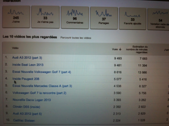 À titre indicatif, voici le « Top Ten » des 10 vidéos les plus visionnées en novembre 2012. Sans tirer de plan sur la comète au niveau de l’analyse, on constate que les dernières nouveautés sont les plus vues, à l’image de l’Audi A3, la Seat Leon, la Golf 7, la Peugeot 208 , la Mercedes Classe A, la nouvelle Dacia ou la DS5 de Citroën.
