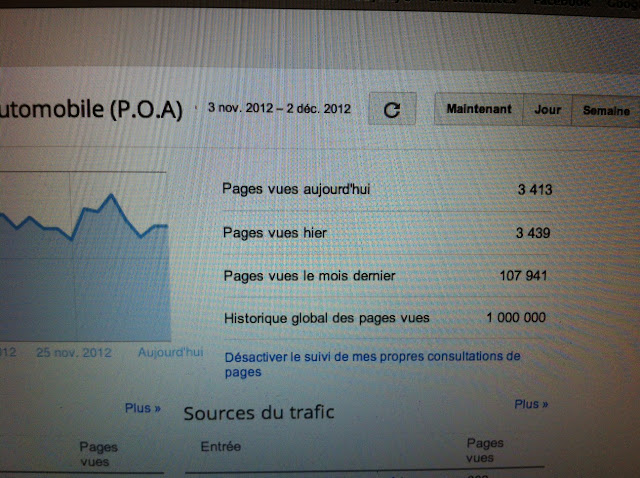Ce chiffre ne représente pas le nombre de visiteurs unique, cette donnée n’est pas fournie par blogspot, mais il confirme une progression régulière et constante de la fréquentation du blog Petites Observations Automobile. En octobre 2012, le nombre de pages vues était de 91 623 avant de passer à 107 000, soit une croissance d’environ 20% en un mois.