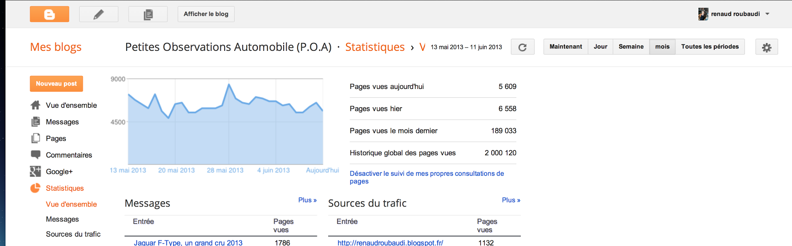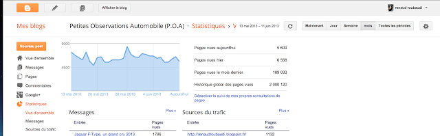 Entre le 12 mai et le 12 juin, le nombre de pages vues sur P.O.A est de 189 023. Il ne s'agit pas du nombre de visiteur unique (blogger ne donne pas ce chiffre) mais il confirme une tendance de visite en légère progréssion ( 182 000 pages vue en mars/avril). Pour l'anecdote POA a cumulé 2 000 000 de pages vue depuis sa création en 2010. La chaine You Tube qui réunit les 600 vidéos de P.O.A depuis l'origine cumule 3 088 866 vues. Keep going