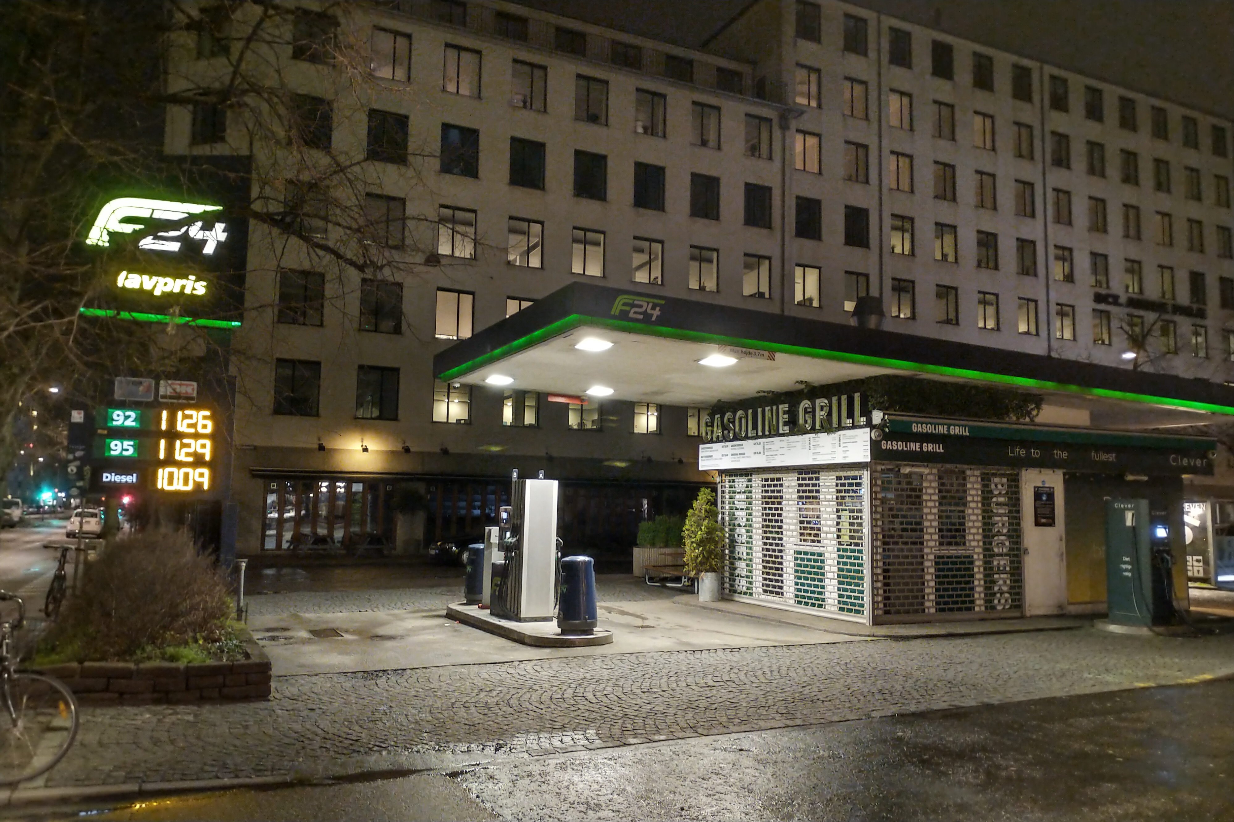 C'est au détour d'une promenade dans le quartier de Kongens Nytorv à Copenhague, à deux pas du Palais d'Amalienborg, où vit la Reine Margrethe II du Danemark, que l'on arrive nez-à-nez sur cette station service « Gasoline Grill » au 10 de la rue Landgreven .Au-delà de l'étrange association des deux noms, le lieu est d'autant plus qu'incongru car au cœur de la capitale danoise 35 % des Copenhaguois se déplacent à vélo.