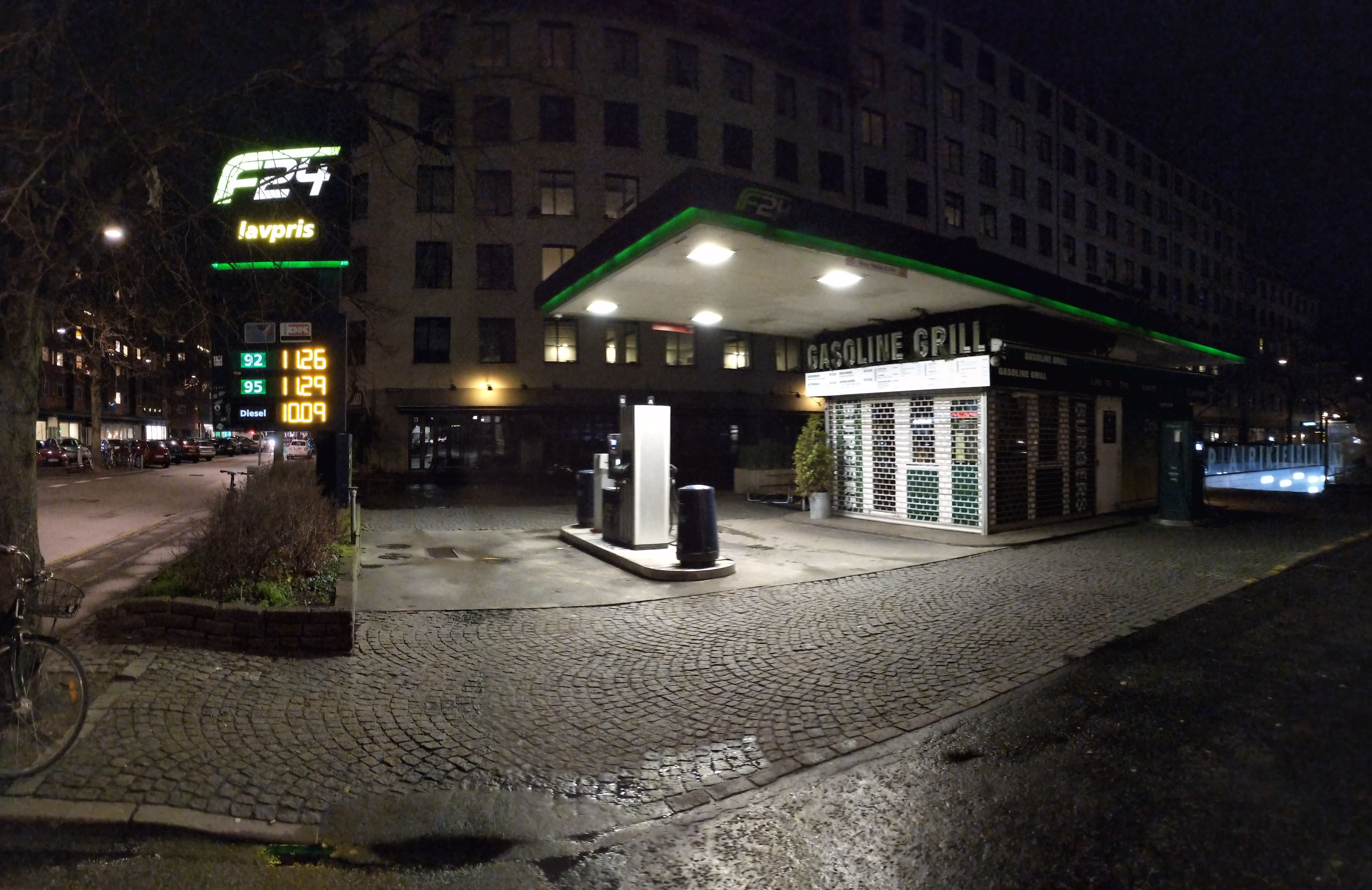 Une petite recherche sur internet et l'on y apprend que « F24 » est une chaîne de l'entreprise pétrolière Q8, autrement dit Kuwait Petroleum International. Le site de l'office de tourisme de Copenhague ainsi que la page Wikipedia sont formels, il s'agit bien d'une « ancienne station-essence transformée en fast-food ». Ouf ! Nous voilà presque rassurés car tous les clients autour de la pompe à essence attendent leur commande et nombreux sont au téléphone.