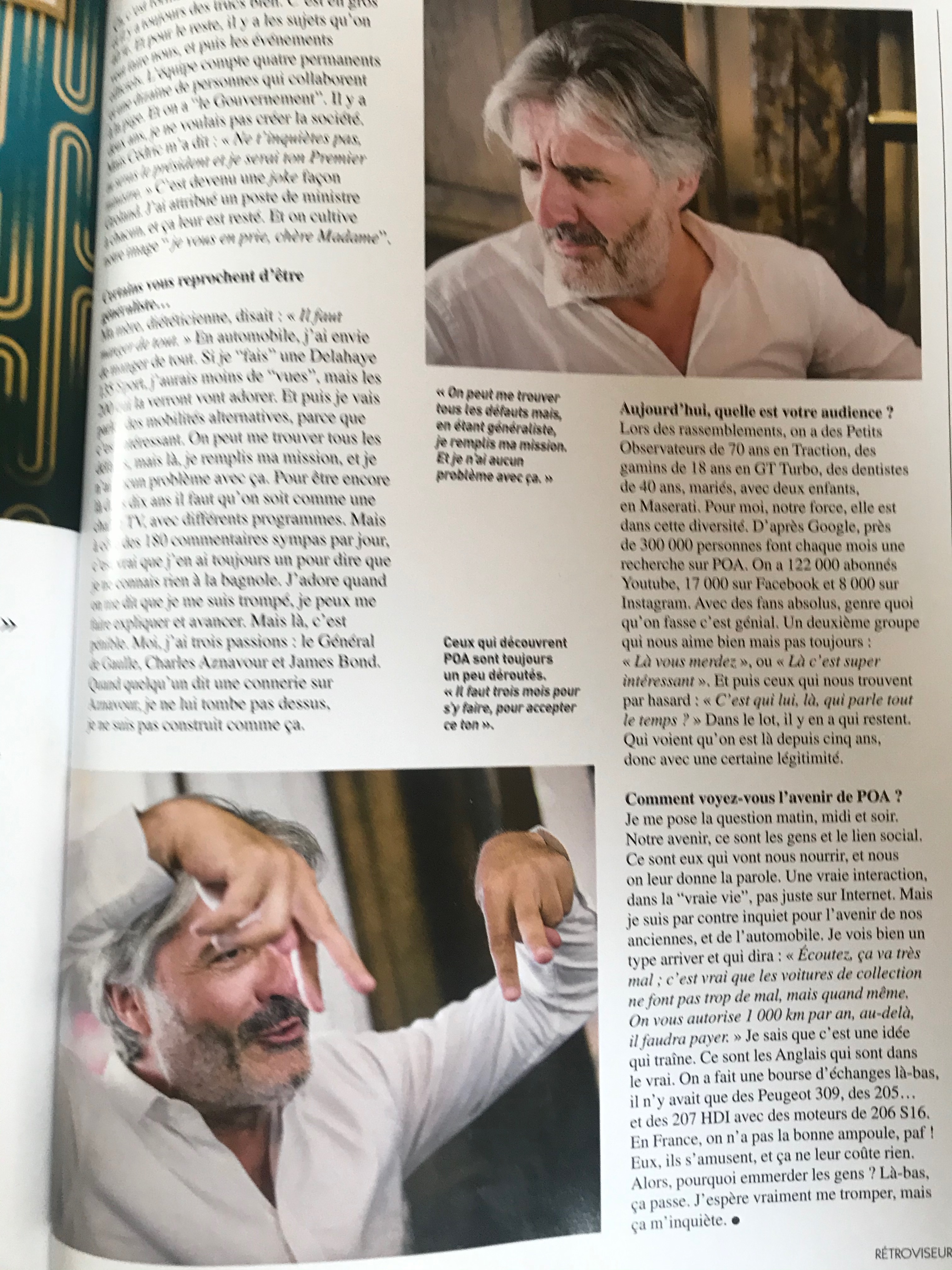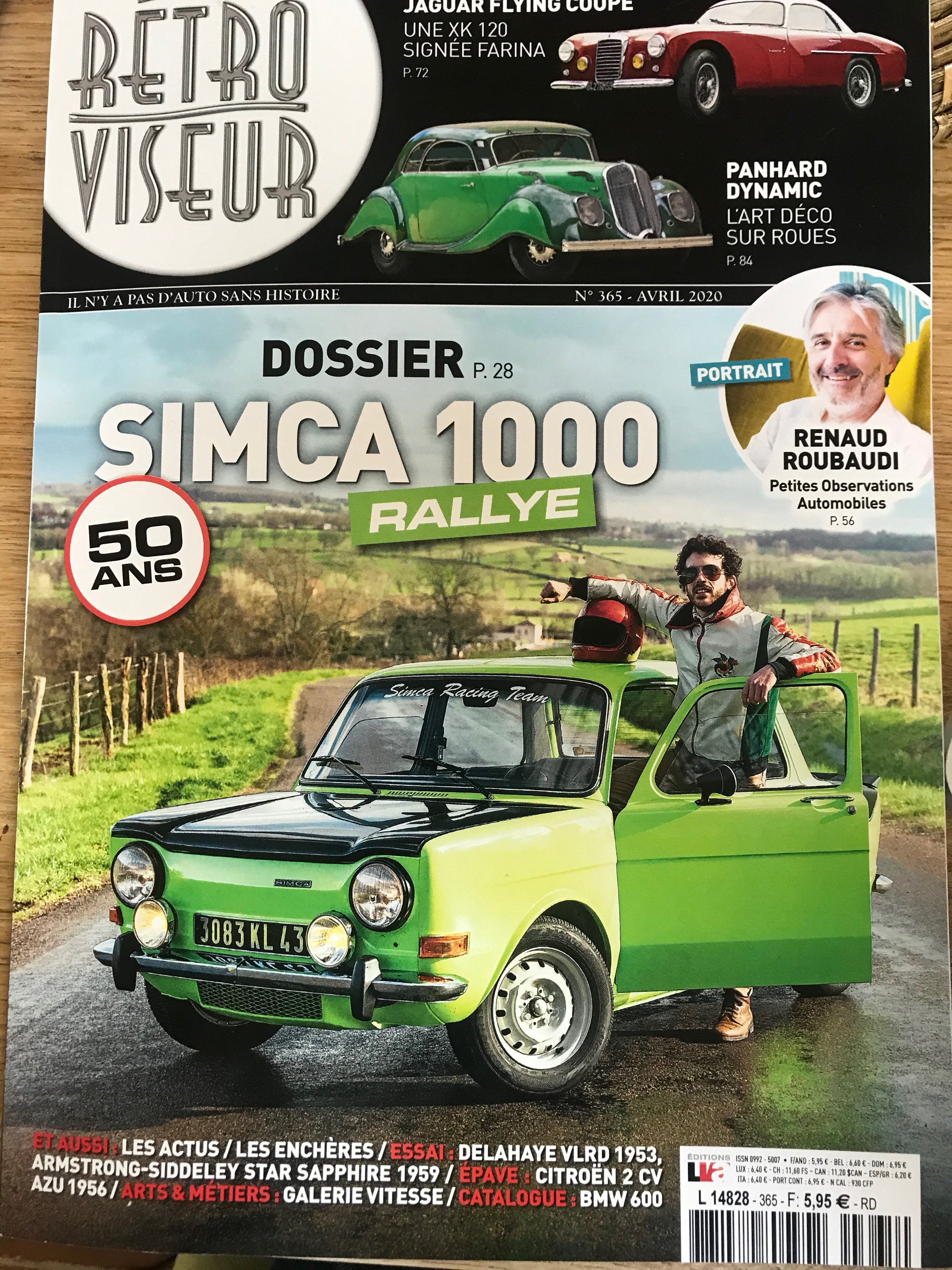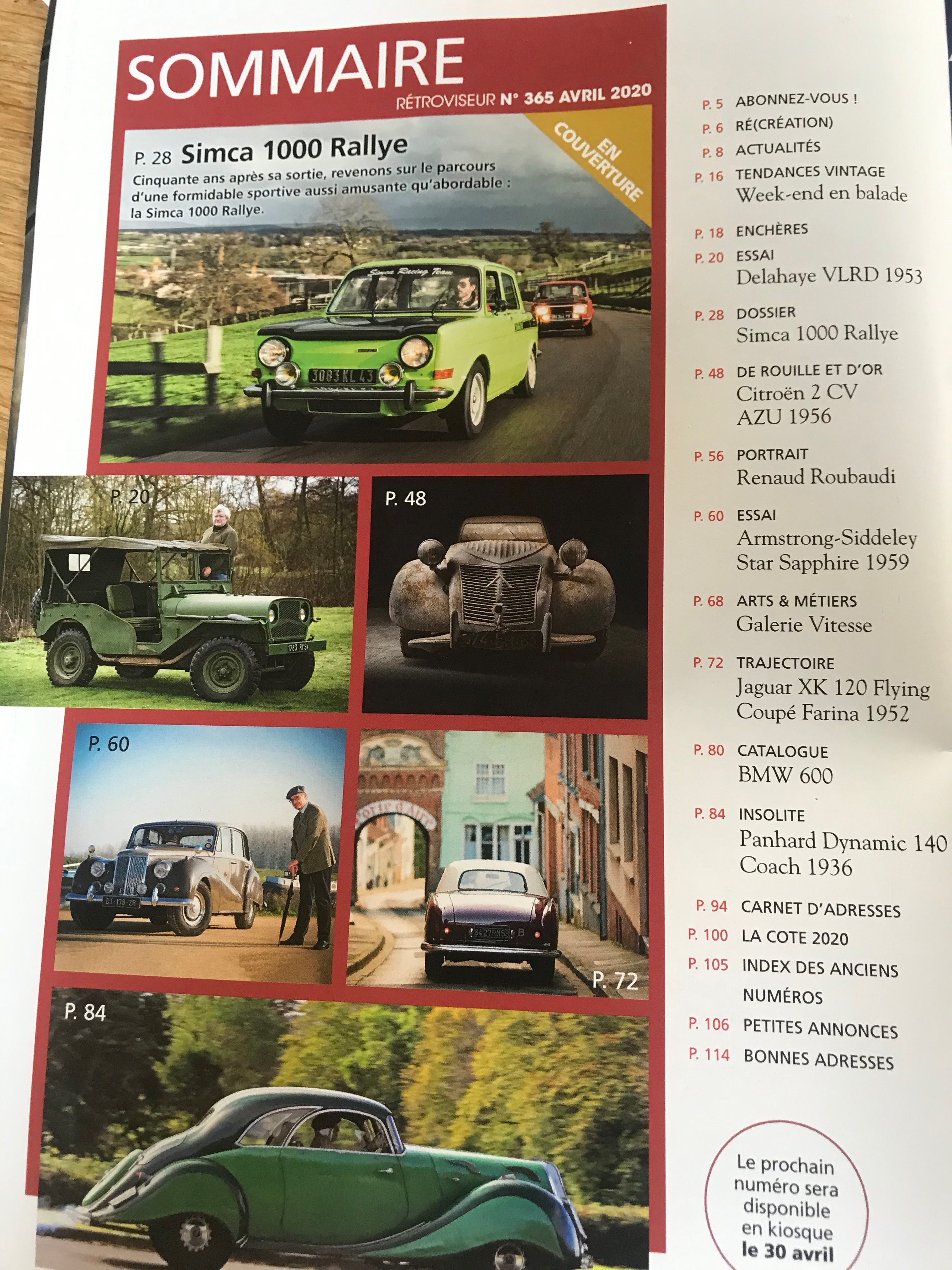 Merci au magazine Rétroviseur (N° avril 2020 en vente en Kiosque ) pour cette interview à propos de POA. Outre ma pomme, plusieurs sujets étonnants, dont la découverte (pour moi) des spécificités de la Panhard Dynamic 140 Caoch de 1936 : moteur sans soupapes, position de conduite centrale, pas de siège avant droit, style incroyable, finition épatante, carrosserie monocoque, suspension avant indépendante, etc.. On découvre aussi Adrien Malbosc qui nous présente toute l'histoire de la Simca 1000 Rallye, en tenue d'époque svp. Adrien véritable bagnolard travaille également pour Auto Retro, l'autre bible du groupe LVA. Longue vie à eux !
