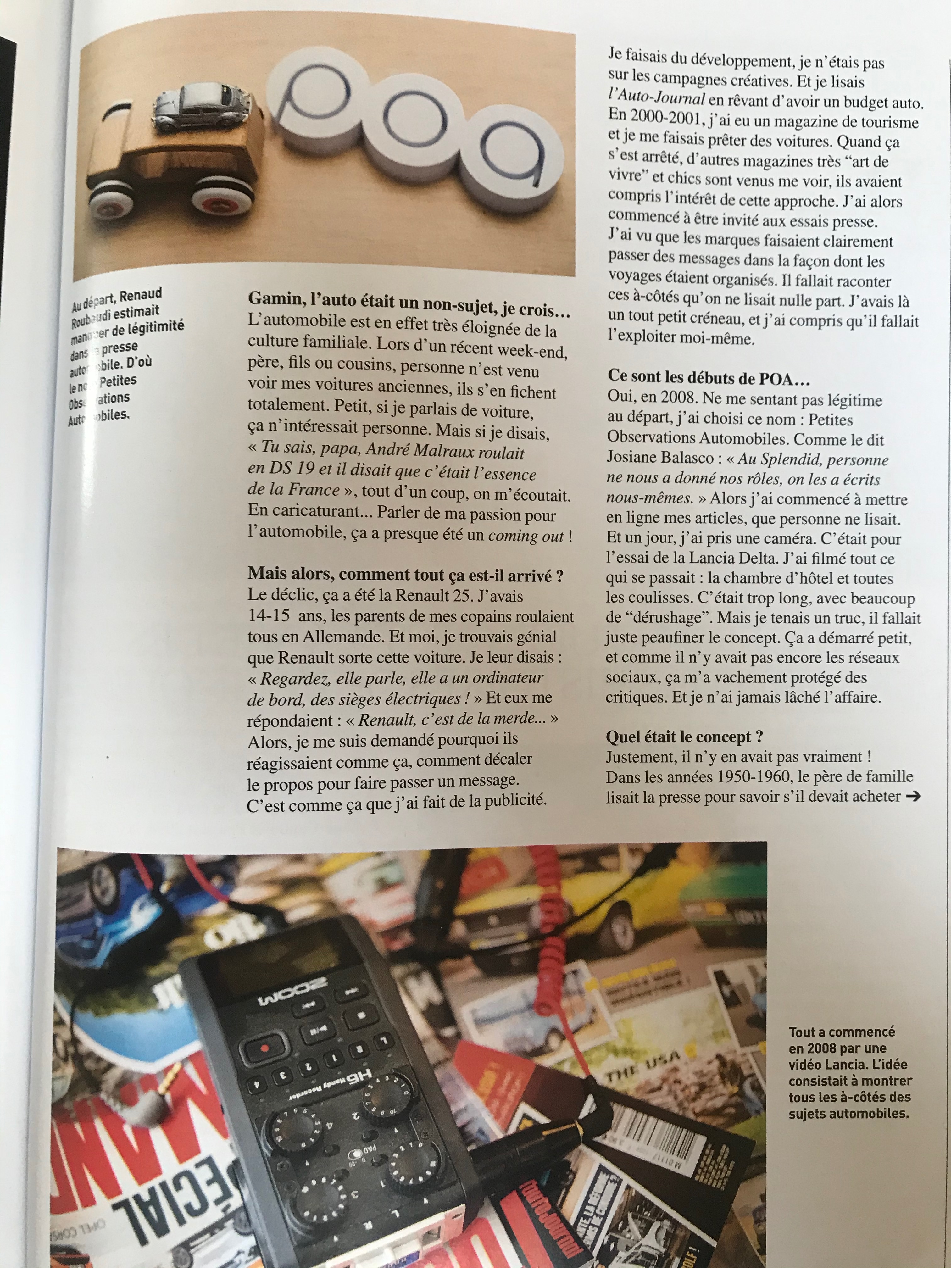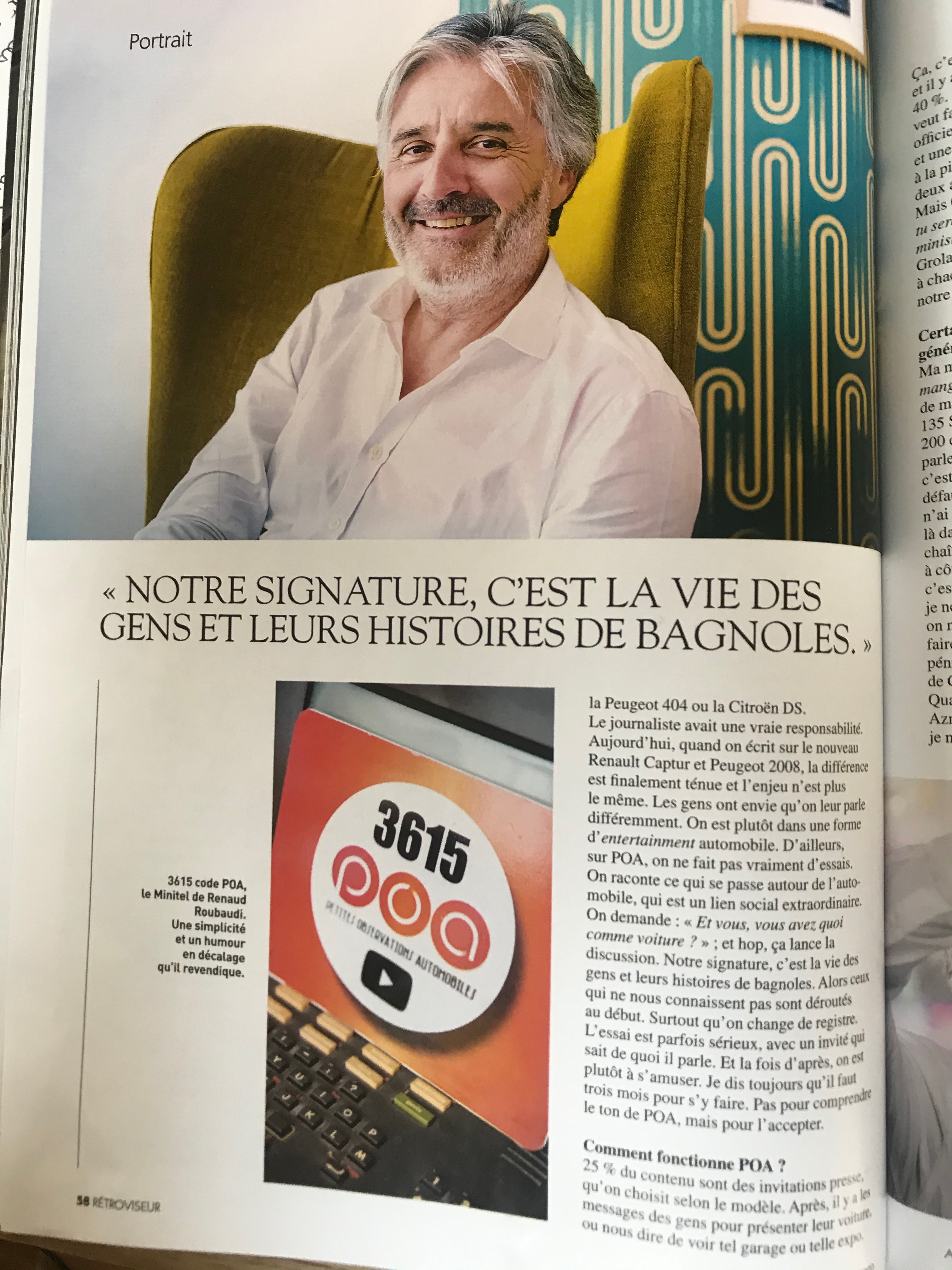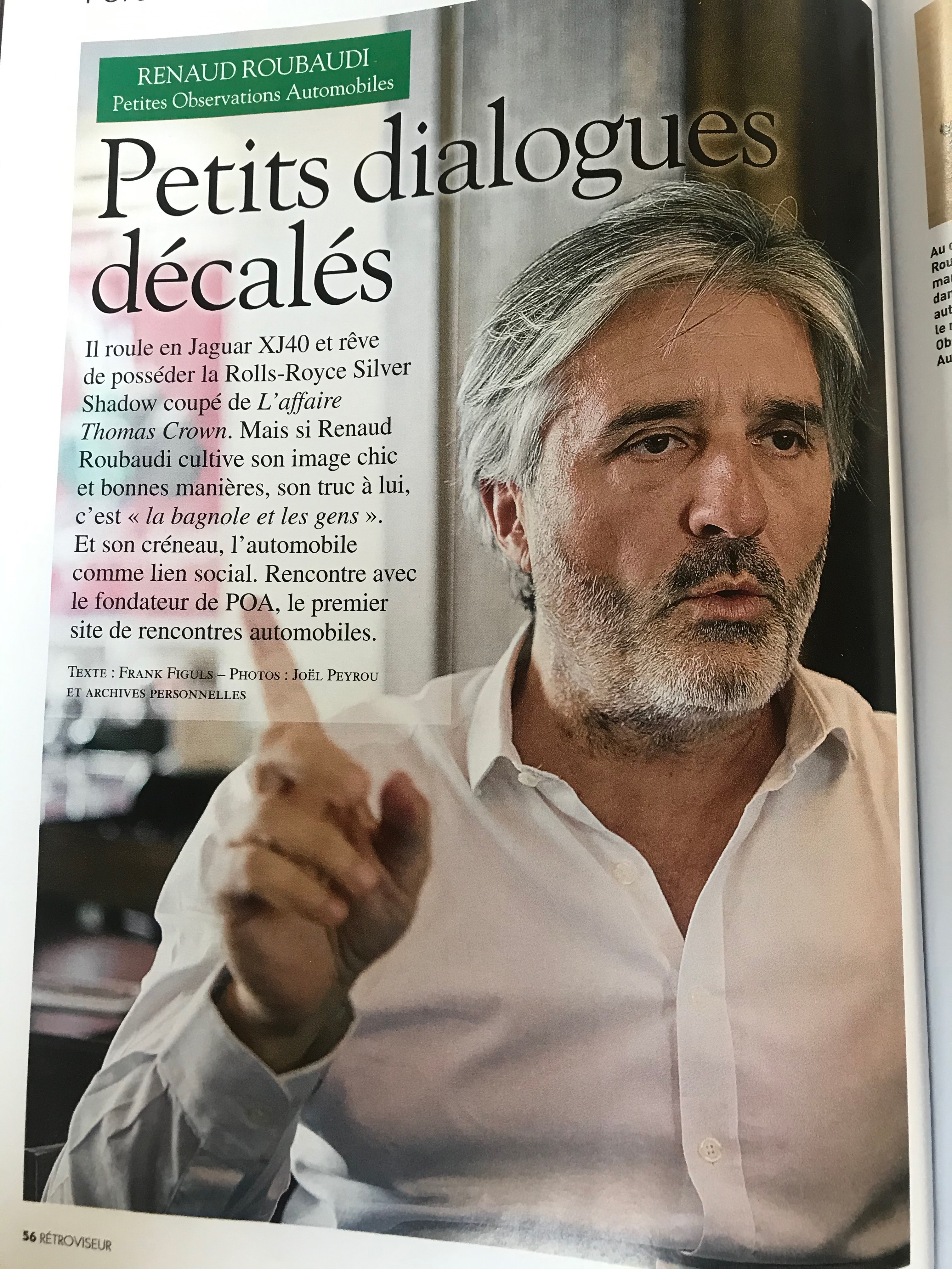 Merci au magazine Rétroviseur (N° avril 2020 en vente en Kiosque ) pour cette interview à propos de POA. Outre ma pomme, plusieurs sujets étonnants, dont la découverte (pour moi) des spécificités de la Panhard Dynamic 140 Caoch de 1936 : moteur sans soupapes, position de conduite centrale, pas de siège avant droit, style incroyable, finition épatante, carrosserie monocoque, suspension avant indépendante, etc.. On découvre aussi Adrien Malbosc qui nous présente toute l'histoire de la Simca 1000 Rallye, en tenue d'époque svp. Adrien véritable bagnolard travaille également pour Auto Retro, l'autre bible du groupe LVA. Longue vie à eux !