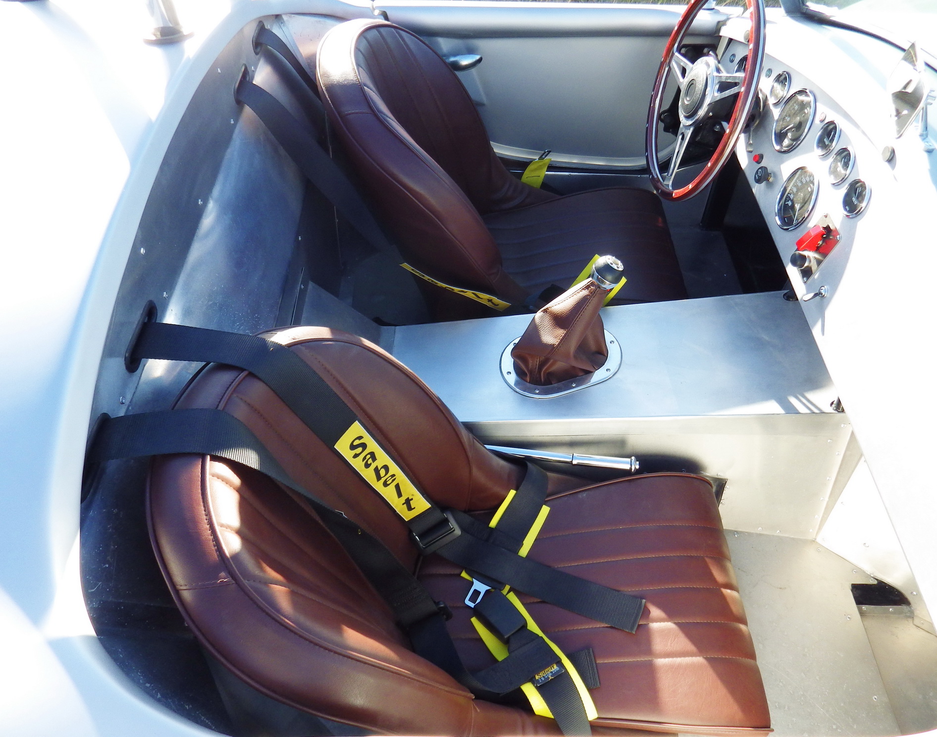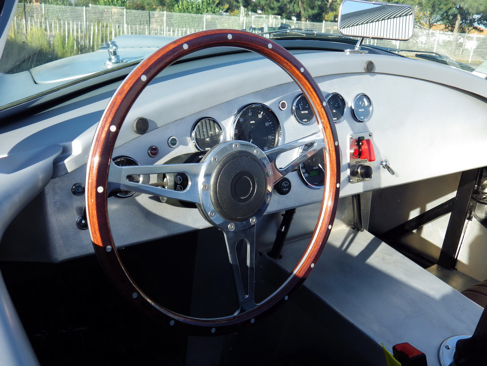 Amortisseurs réglables, gros freins et surtout larges roues de 15 pouces type 427 qui ont demandé beaucoup de travail sur la caisse en polyester. Loulou explique " J'ai essayé de trouver une caisse alu comme sur les vraies Cobra mais c'était impossible, d'où le choix d'une peinture imitant l'alu. On a du élargir les passages de roues pour monter les grosses jantes en alliage Halibrand comme sur le modèle d'origine. Mais à cause du large caisson de la boîte de vitesse, les sièges qui ne rentraient plus ont exigé un gros travail sur la carrosserie en interne. Mais aujourd'hui après des mois et mois de travail, elle est comme je le souhaitais".