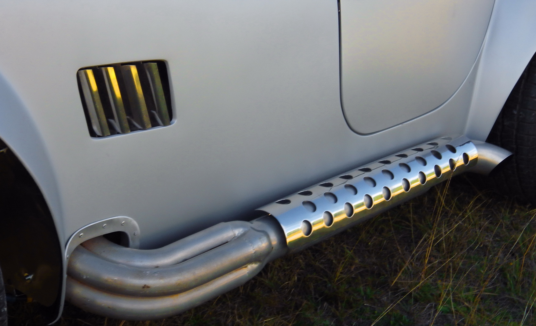 D'abord il a fallu acheter un gros moteur Ford V8 5 litres légèrement préparé (4 carburateurs double corps) et qui lâche une sonorité merveilleuse par son superbe collecteur d'échappement en inox réalisé par un artisan comme de nombreuses autres pièces telles le réservoir et autres supports. Éric jauge sa puissance à environ 300 ch estimant que c'est suffisant et on veut bien le croire quand on se souvient que la voiture dépasse à peine les 1000 kilos et accélère de 0 à 100 km/h en 4,5 secondes en arrachant la tête.