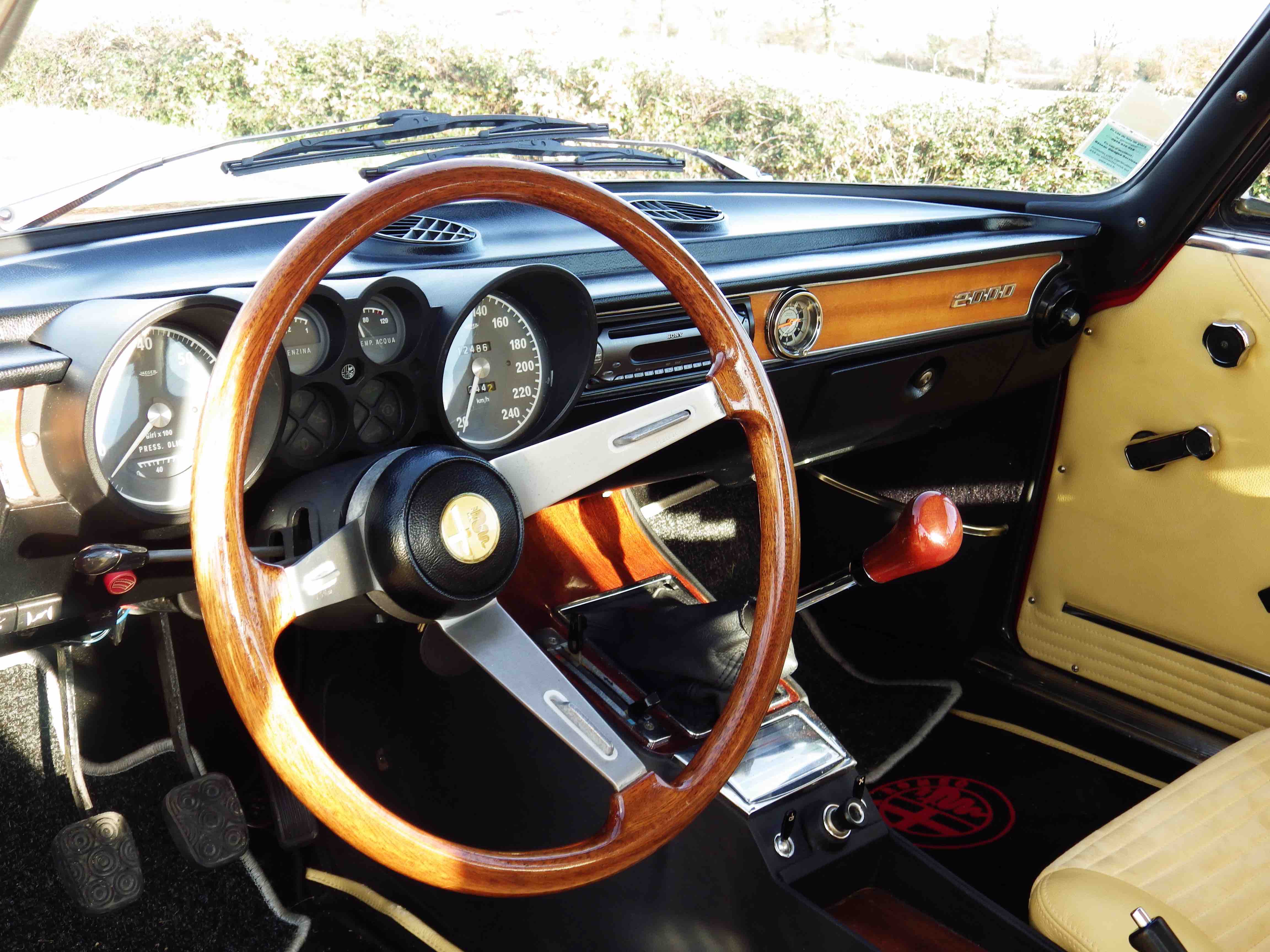 Tout est dessiné pour le plaisir de l'œil, du beau volant tulipé en bois, des petits cadrans et monomètres écrits en italien, du levier qui jaillit du plancher juste sous la paume de ma main, du dessin de la planche de bord en bois. Dans la hiérarchie des GTV, on s'accorde à trouver la 1750 esthétiquement plus pure surtout au niveau de la sublime planche de bord à console centrale suivi de près par la 2000 et après par la 1600. Esthétiquement, la 2000 se reconnaissait de la 1750 par sa calandre striée, ses butoirs et feux arrière plus imposants. Chaussée de jantes en alliage optionnelles plus larges (185X14), la 2000 GTV de Claude, dégage une sensuelle agressivité.