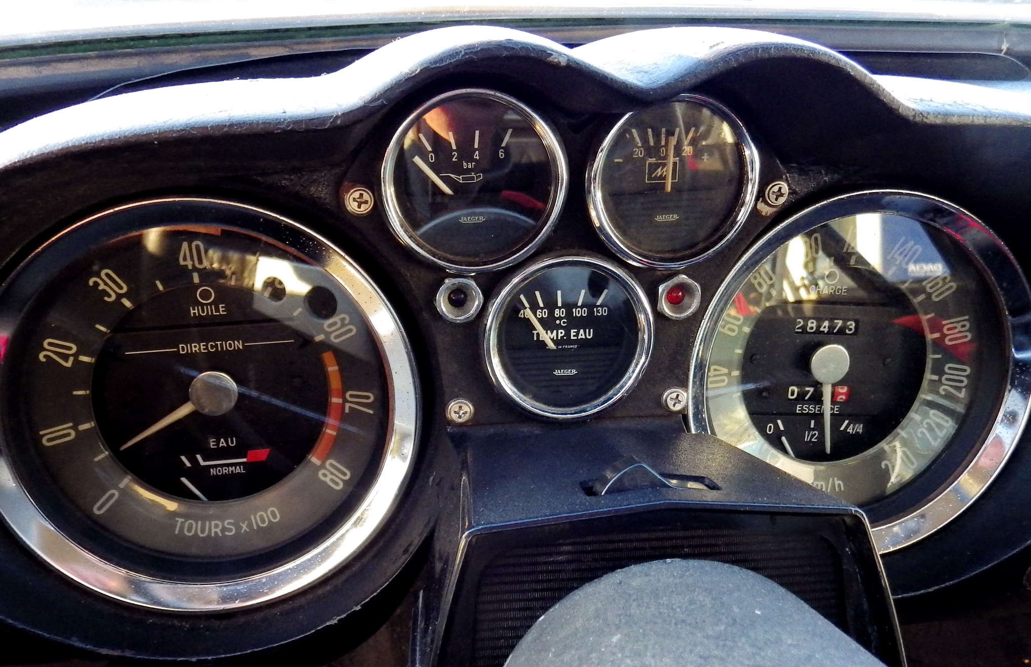 Belle instrumentation comprenant un manomètre d'huile. On reconnait le boitier de direction de la R8
