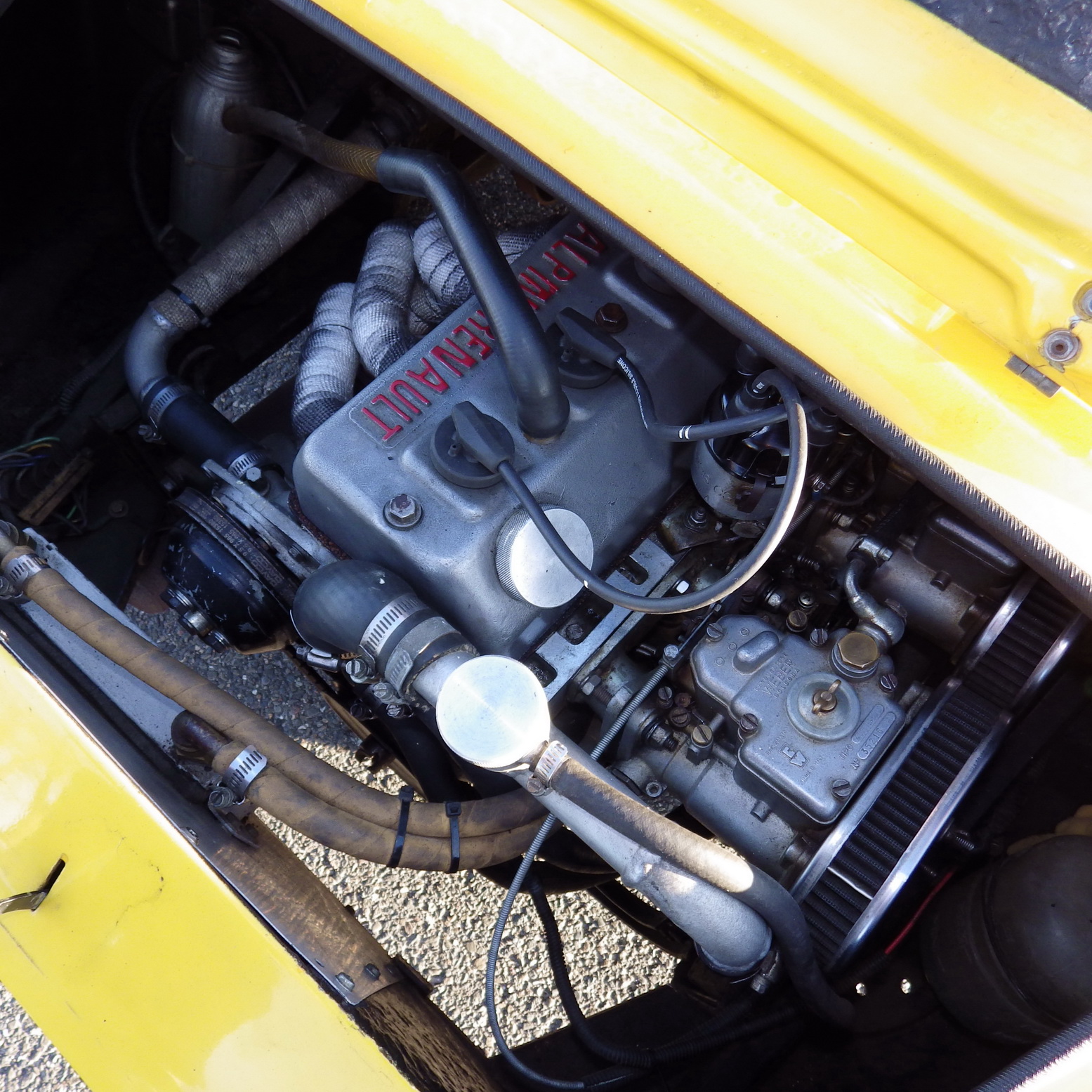 Son Alpine à troqué son petit 1108 cm3 contre un 1400 plus récent de Renault 5 Alpine légèrement préparé (deux carburateurs double corps de 40) qui, d'après son propriétaire, doit développer entre 100 et 105 ch DIN, puissance des 1300 S en 1969. Comme ces dernières, pour améliorer le refroidissement, le radiateur d'eau est passé de l'arrière à l'avant. Des jantes larges de 175X13 ont remplacé les frêles 145 X15 mais en conservant l'anachronique carrossage négatif à l'arrière dû à la suspension à essieu brisé au carrossage variable. Le reste semble conforme à toutes les Berlinette qui étaient presque mon quotidien lorsque je travaillais pour le Magazine échappement où il n'était pas rare d'en compter une bonne vingtaine au départ d'un rallye et course de côte.
