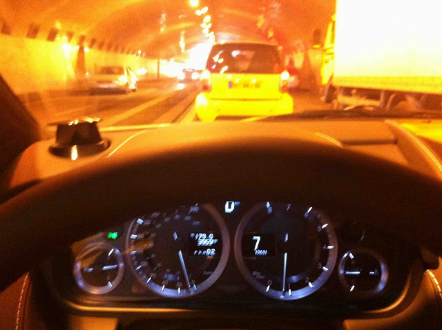 Je me rends compte alors que le logo a disparu, enlevé par un fan. Ce sera le seul geste déplacé de la semaine, mais comme le souligne ma femme « c’est assez bohème une Aston sans signe d’appartenance ». Son sens pratique lui fera aussi noter qu’à 190 000 € il n’y a aucun espace de rangement pour son grand sac à main. Messieurs les ingénieurs d’Aston Martin encore un effort. Nous casons les trois sacs souples sur le siège libre à l’arrière et nous voilà sur l’A13 Autant dire une formalité pour ce TGV de la route qui se révèle ferme mais confortable. En passant devant une cabine radar, j’observe le compteur gradué jusqu’à 330 km/h et la consommation moyenne qui indique 23l/100. Je m’interroge alors sur la raison d’être de cette voiture en 2011. Ce n’est plus la puissance, la vitesse ou le statut social, c’est d’abord la certitude de posséder un objet authentique et, pourquoi ne pas le dire, une œuvre d’art roulante, une machine à sensation. Le luxe en un mot.
