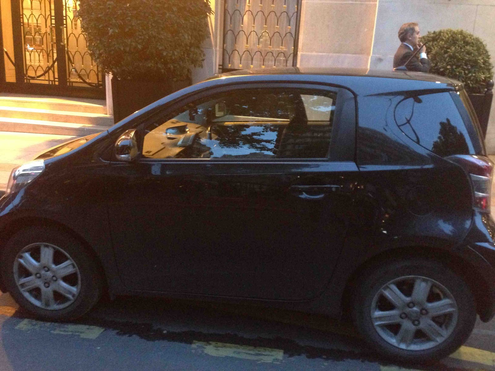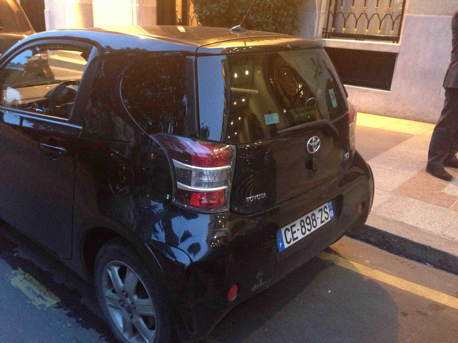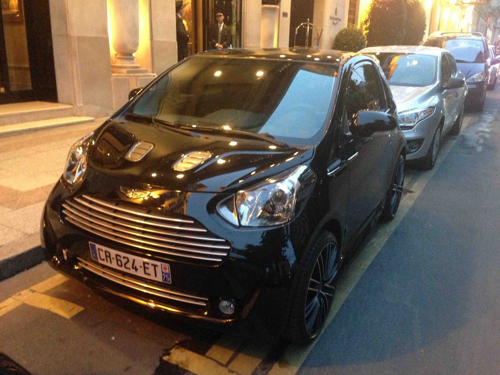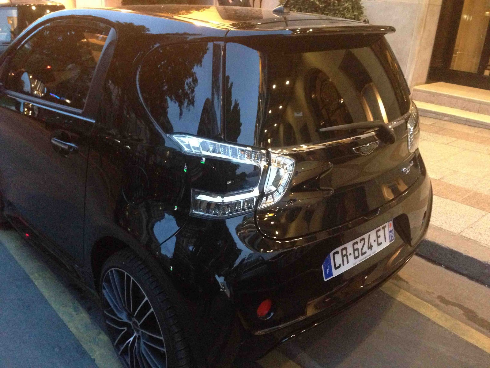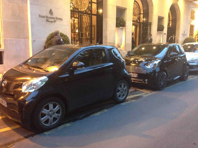 La vie est amusante. Croiser l'une dernière l'autre une Toyota IQ et son clone de luxe l'Aston Martin Cygnet devant le Georges V ruine les efforts du marketing d'Aston Martin pour justifier les 38 000 euros de la Cygnet face au 13 300 euros de la Toyota IQ. Cherchez l'erreur comme l'on dit.