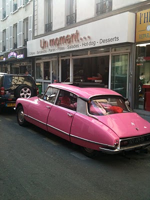 Cette Citroën DS rose bonbon se ballade du côté de la rue des petites écuries. Visiblement, elle est utilisée quotidiennement et son conducteur qui ballade femme et enfants à son bord. Une vraie star qui aurait pu faire de la figuration dans un film avec Peter Sellers.