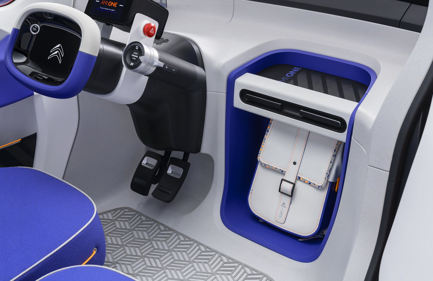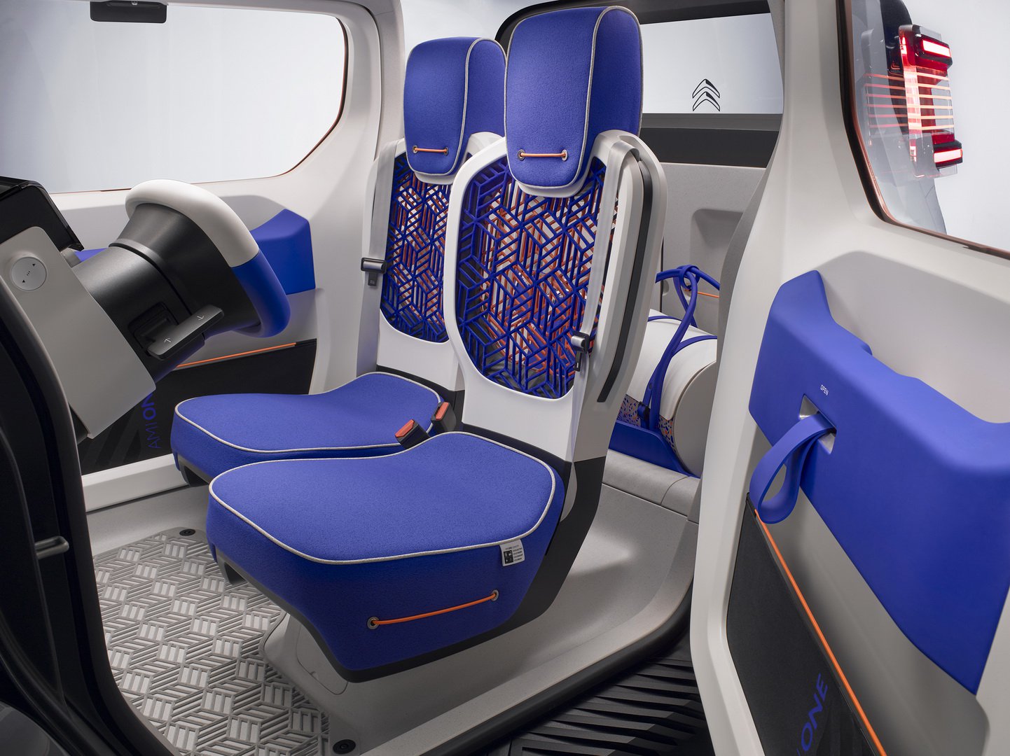 Les designers d’Ami One Concept ont imaginé pour le siège conducteur (sur glissière) et le siège passager (fixe), une disposition asymétrique. Ceci afin de gagner en espace au niveau des épaules et d’offrir une aisance de mouvement à chacun des occupants. Les généreux coussins d’assises et les appui-têtes se distinguent par un textile Bleu profond d’inspiration ameublement " outdoor " facile à entretenir, agrémenté d’élastiques Orange.