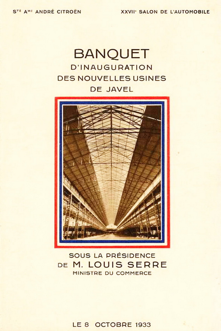 Dimanche 8 octobre 1933. Ce jour-là, André Citroën a mis les petits plats dans les grands. Dans l'immense hall de sa nouvelle usine de Javel, se tient un fabuleux banquet de 6 333 convives. L'industriel a invité ses meilleurs concessionnaires, ses principaux fournisseurs, nombre de ses employés, des notables, un ministre pour leur dévoiler sa nouvelle usine où sera produite sa future voiture révolutionnaire.