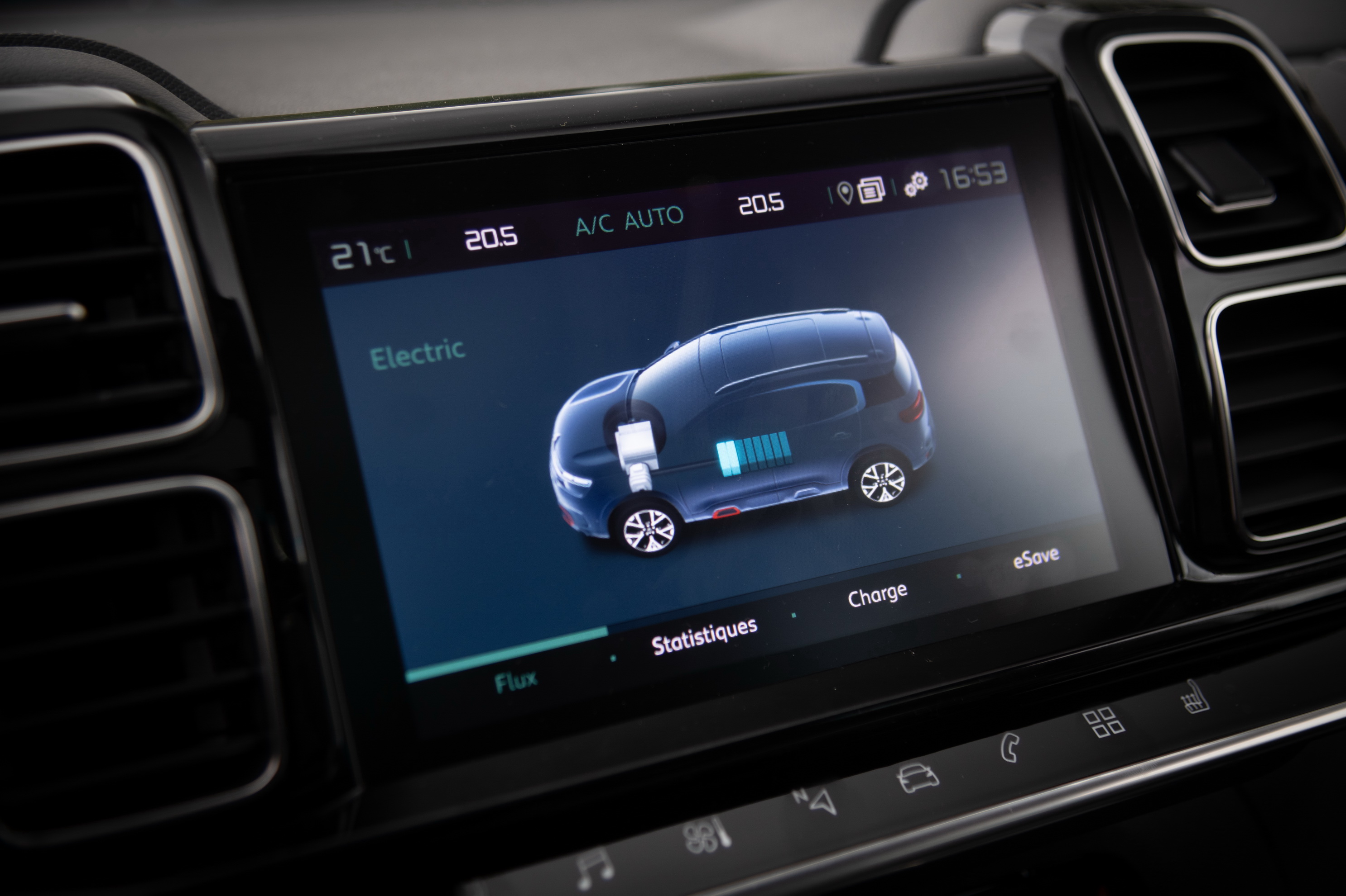 On peut facilement suivre les flux de motorisation sur l'écran central où il est possible de programmer la recharge.La prise de recharge est à gauche opposée à la trappe du réservoir à droite