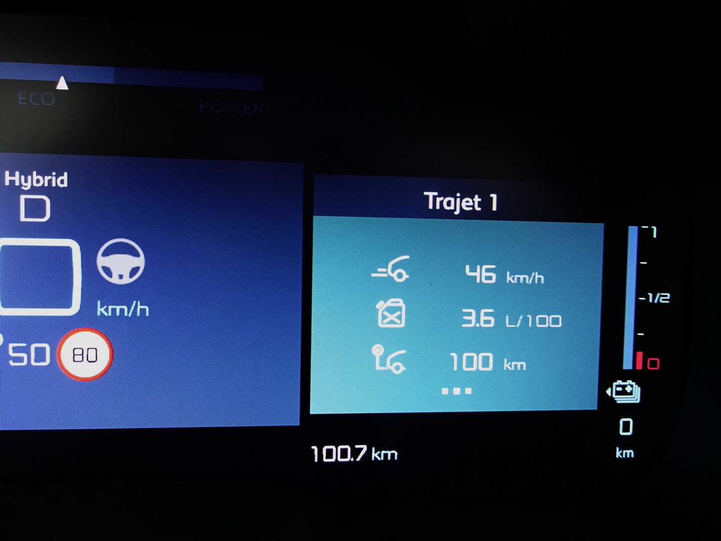 Le C5 Aircross peut théoriquement parcourir 55 km en mode électrique en dessous de 70 km/h expliquant son homologation à 1,6 aux 100 et 32 g/km WLTP. Un chiffre très théorique évidemment. En conduisant calmement sur un parcours peu rapide composé de ronds point et de ralentisseurs, après avoir parcouru 46 km, le moteur thermique a imperceptiblement reprit le relais, en douceur et sans à-coups. En conduisant aussi calmement (voir photo), uniquement en mode thermique, le C5 a avalé autour de 7,2 aux 100 de carburant contre 8,5 l sur autoroutes. Signalons qu'une fonction permet d'atteindre 135 km/h en mode 100 % électrique contre 70 km/h mais à ce régime, la baisse de la jauge de la batterie devient terriblement anxiogène.