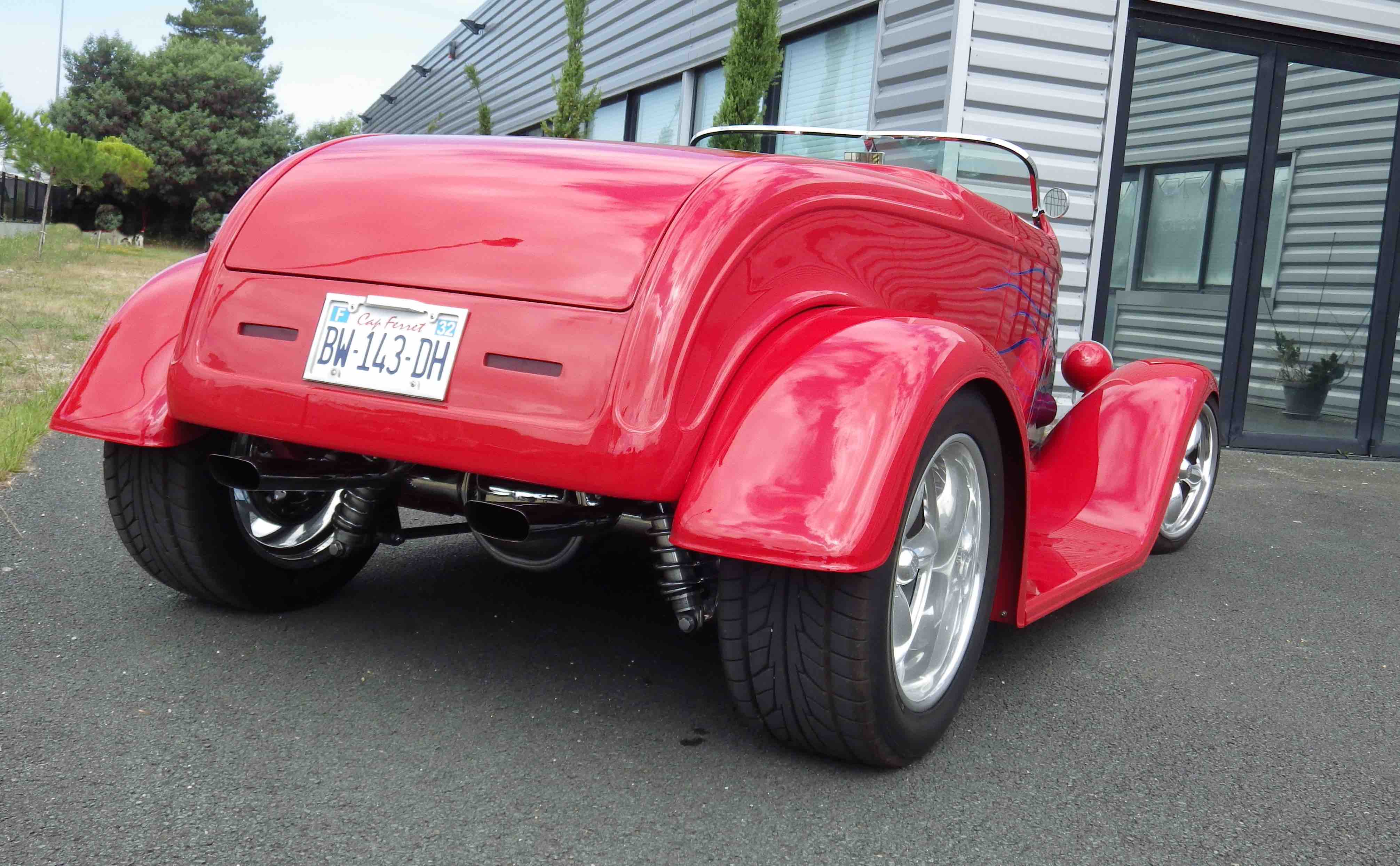 " J'ai eu le coup de foudre en le découvrant. Réalisé sur une base de Ford B 1932 comme beaucoup de rods, il avait été construit à 6 exemplaires seulement. Il se caractérisait par son superbe pare-brise profilé en V type Duvall inventé dans les années 30 ainsi que ses roues découvertes". Jacky le fait acheminer en France où il le modifie en rajoutant un jeu d'ailes spécifiques également achetées aux USA pour couvrir les généreux boudins.