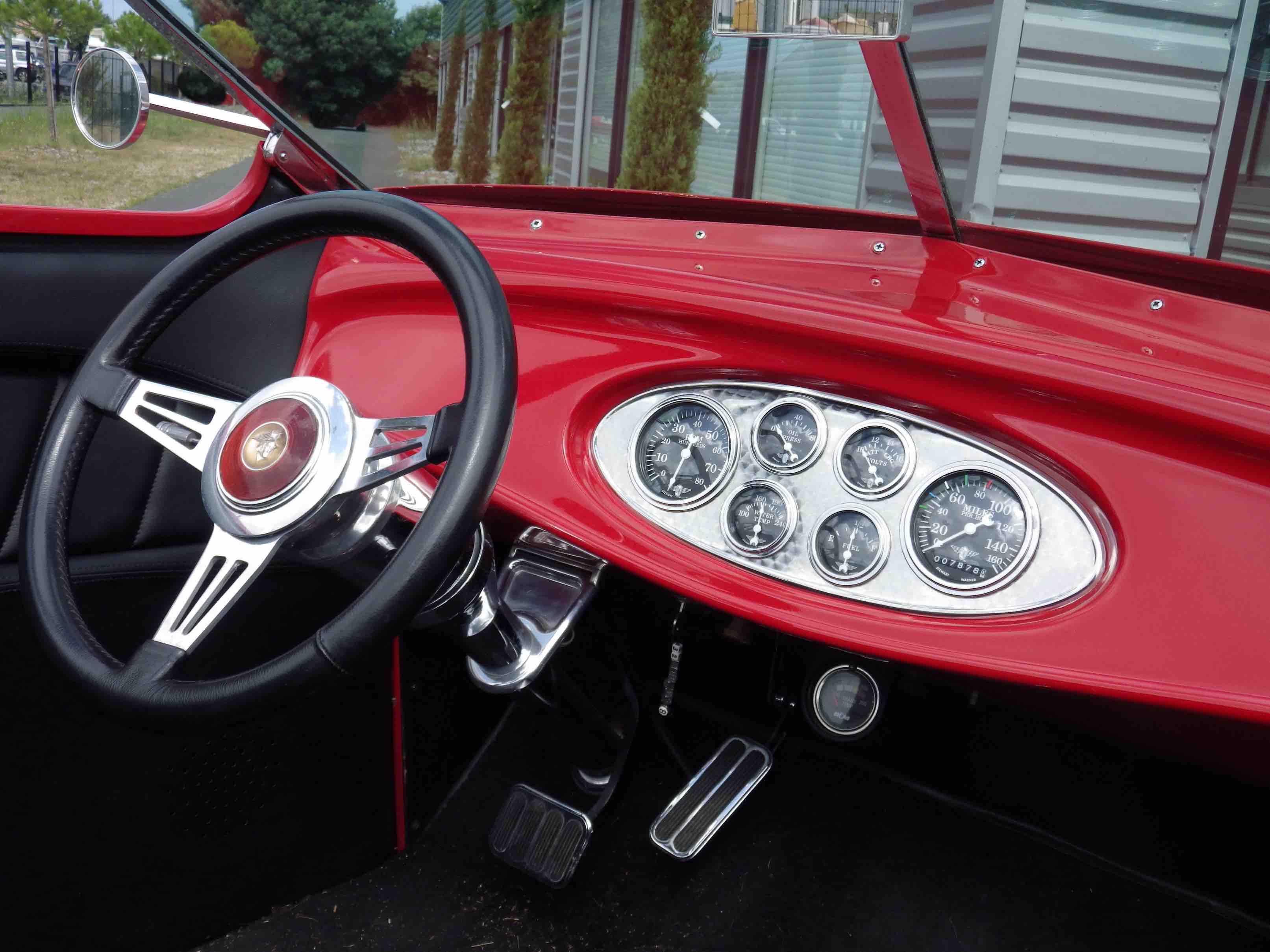Il nous fait faire le tour du propriétaire. Devant, bien enfoncé à la place du flathead V8 Ford latéral d'origine se cache un colossal moteur de Chevrolet Corvette de 5,7 l de plus de 350 chevaux accouplé à une boîte auto à 4 rapports. Suspension avant d'origine et arrière à essieux rigides surbaissés et entièrement chromés, freins avant à disque. Les énormes jantes chromées à large déport de 17 et 18 pouces ont été fabriquées sur mesure pour affleurer les colossales ailes. La planche de bord est sublime avec sa plaque ovale centrale bouchonnée regroupant tous les compteurs et son volant Lecarra ganté de cuir.