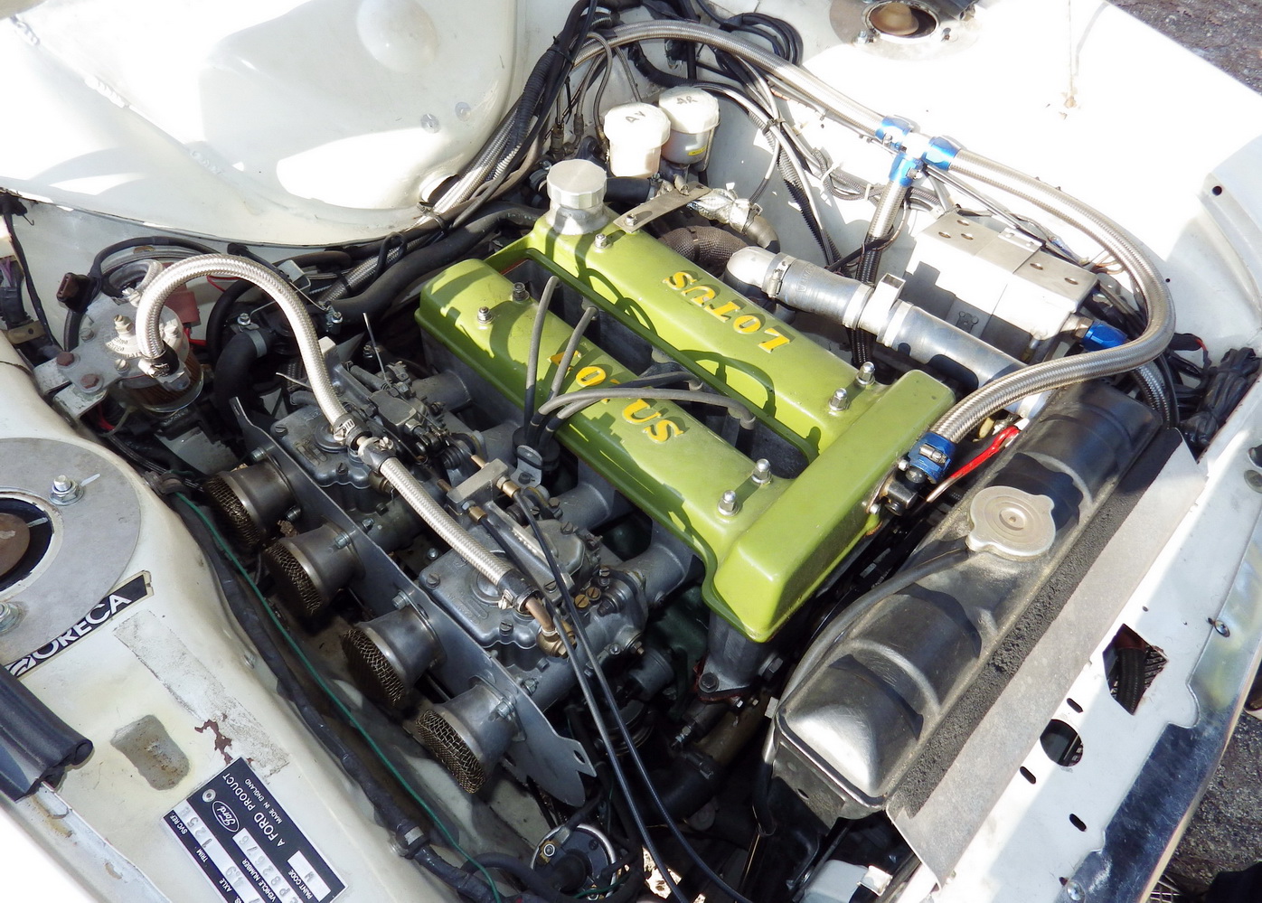 En fait, Lotus ne conservait que le bloc en fonte Ford à vilebrequin à 5 paliers d'origine dont il portait la cylindrée à 1558 cm3. Il le coiffait d'une magnifique culasse maison à double arbre à cames en tête à grosses soupapes, alimenté par deux gros carburateurs Weber de 40. Sa puissance grimpait de 58 ch DIN à 105 ch DIN pour le modèle se série et presque 150 chevaux en compétition. 105 ch était une puissance exceptionnelle pour une voiture de cette cylindrée en 1963. Celles qui courent aujourd'hui en circuit en historique frôlent les 200 chevaux à 9 000 tr/mn. La voiture de Christophe destinée au rallye bénéficie d'un moteur plus calme et mieux adapté à ce type d'épreuve.