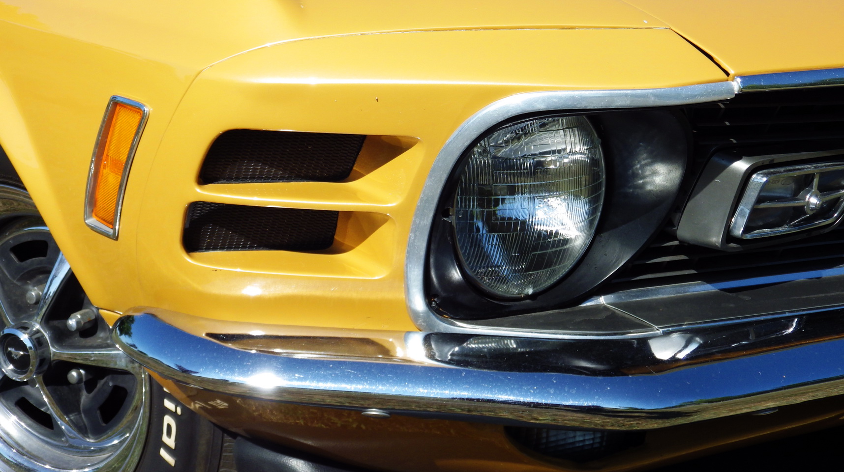 Cette Mach 1 de couleur "amber gold" est la vingtième américaine de Franck qui nous avait dévoilé il y a un an sa Cadillac 1960. "C'est ma sixième Mustang qui succède à un fastback 1968. C'est un millésime 1970 achetée dans le Michigan via un transitaire qui a compté seulement deux propriétaire et ne totalise que 120 000 kilomètres d'origine ce qui est assez peu pour ce genre de voiture. Elle est dans un état assez étonnant pour ses presque 50 ans " raconte notre passionné sur fond sonore du grondement irrégulier des huit pistons qui ont repris un rythme plus tranquille mais toujours aussi sourd. En 1969, pour la 3eme fois depuis 1964, la Mustang fut redessinée en adoptant un style plus sportif au pavillon surbaissé assorti d'un avant plus agressif. Désormais baptisée Sportswoof, son arrière fuyant reprenait en plus écrasé le dessin de la précédente fastback 1968. Plus longue (4,76m), plus large, plus lourde, elle chaussait de nouvelles mécaniques plus puissantes s'articulant du 6 cylindres au gros et lourd 7 litres de plus de 400 chevaux dont la conduite était, parait-il encore plus folklorique, rarement parallèle à la route.