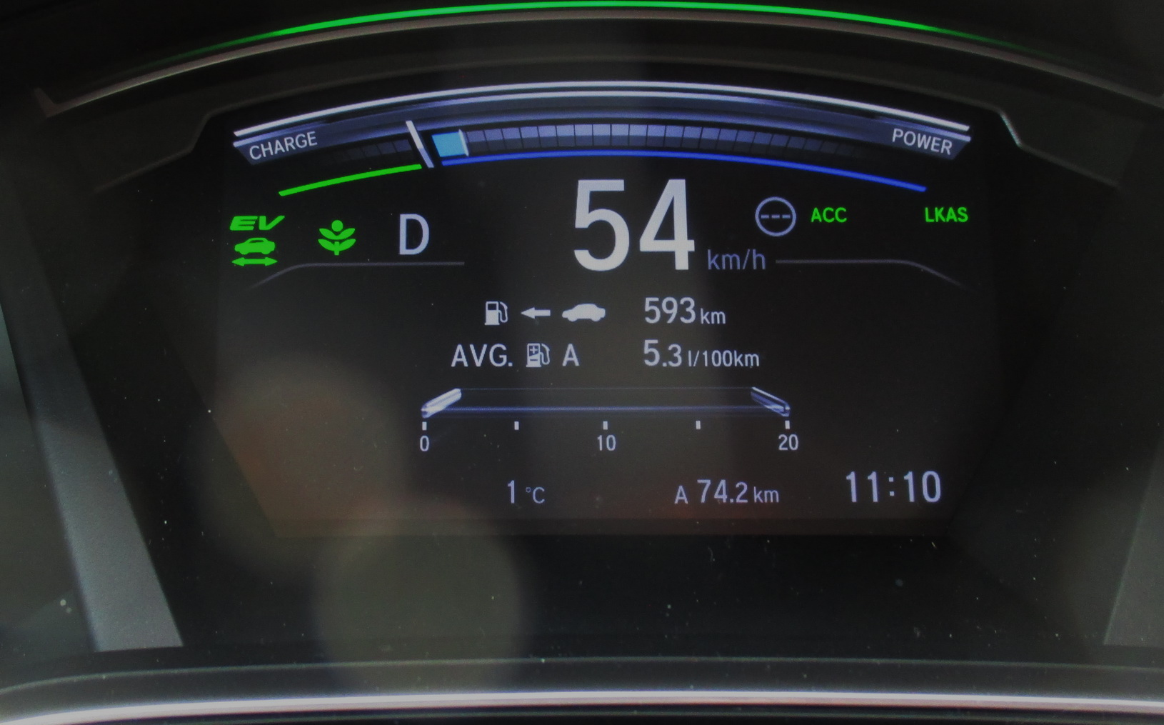 Pour ce faire le CR-V n'est pas équipé d'un compte-tours ce qui est un choix philosophique signifiant que le moteur thermique est secondaire. Je pense que c'est une erreur, car par son fonctionnement, un compte-tours témoignerait des diverses sources d'énergie. Cela dit, il est possible d'afficher les divers flux d'énergie mais leur lecture n'est pas très visible. C'est certainement un tic de journaliste car un possesseur de CR-V se satisfera plus de sa faible consommation que de la façon dont il l'obtient.