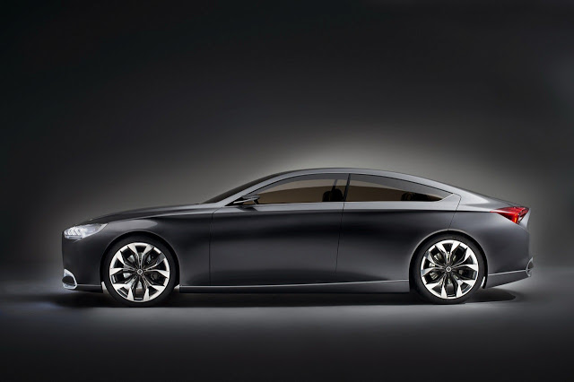 Ça y est, les Coréens n'ont plus aucun complexes d'infériorité vis vis des Allemands. Le concept de berline premium le prouve : calandre massive façon Audi, profil de coupé 4 places façon Mercedes, arrière marqué façon Lexus, cette Hyundai est un savant cocktail de tout ce qui ce fait aujourd'hui. Malgré ces influences, le résultat en impose et c'est là l'objectif. Peter Schreyer, big boss du design de Hyundai et Kia (ex Audi), doit s'éclater, d'autant que la direction du groupe lui a déroulé le tapis rouge en le nommant au board mondial. Une première pour un non Coréen.