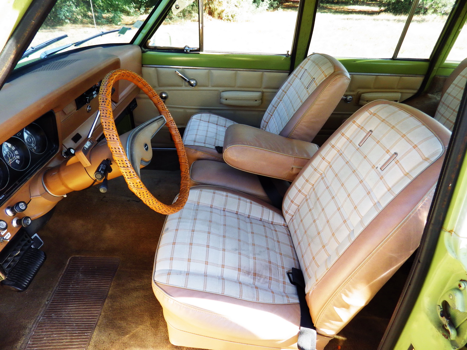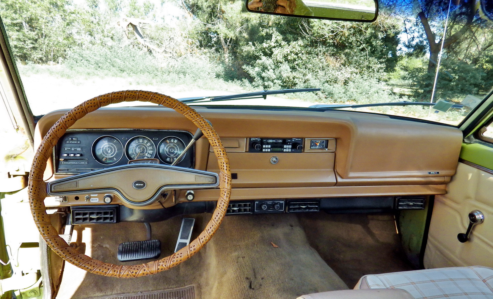 Le gros V8 de 5,9 l lâche un bruit de péniche dans son martèlement tranquille sur le chemin qui nous emporte à la séance photo. Avec un essieu rigide autant à l'avant qu'à l'arrière, je m'attendais à être plutôt secoué. Pas du tout ! Le gros SUV roule mollement sur ses suspensions tandis que ses larges sièges participent à son étonnant confort au sein d'une conduite bien à l'américaine avec sa direction très assistée et sa boite auto du genre glissante. Vous êtes à bord d'un Wagoneer 1975, année qui se situe à la moitié de la longue vie de ce SUV qui a vu le jour en 1962 et a été produit près de 30 ans jusqu'en 1991 sans trop de modifications excepté de nombreux changements de moteurs.