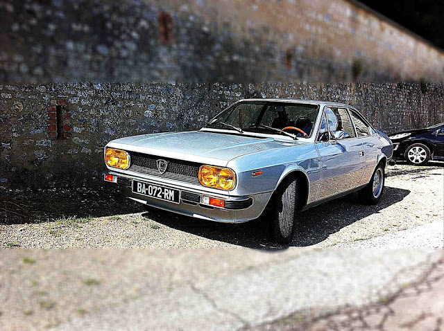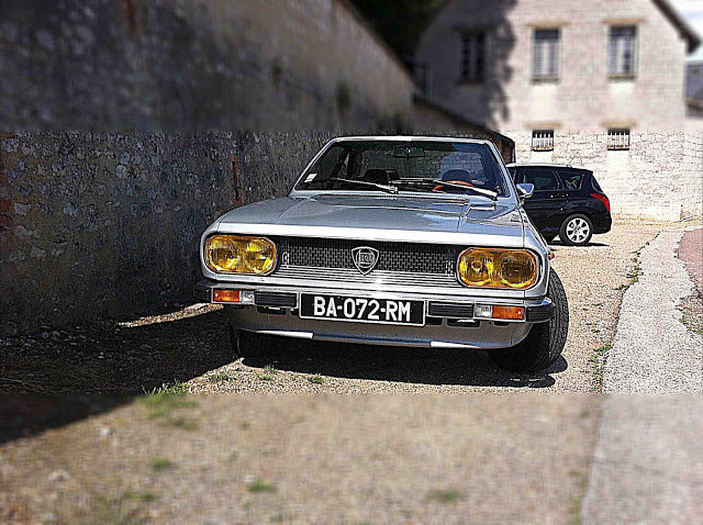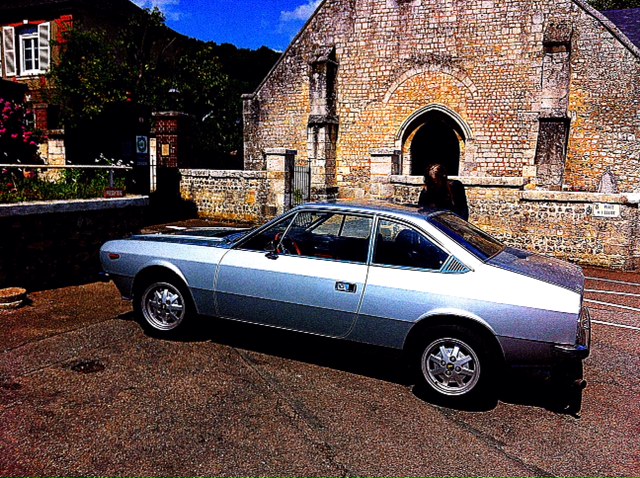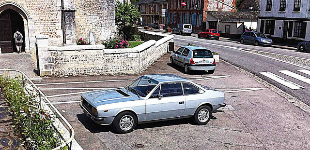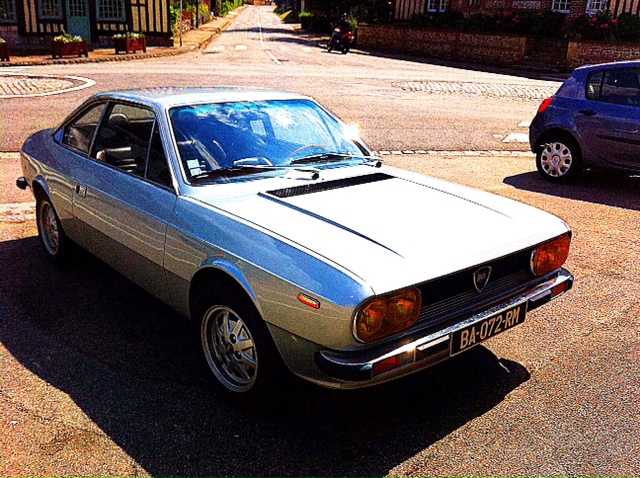 Lancia coupé Beta 2000, 1977, 2 ème série. Traction avant, 5 vitesses, Suspension avant et arrière à roue indépendante, Moteur 4 cylindres en ligne, transversal incliné vers l'arrière, double arbre à cames en tête, 119 ch à 5 500 Tr/mn, 4 freins à disque, 845 kg, 3,99 m de longueur, 188 km/h...