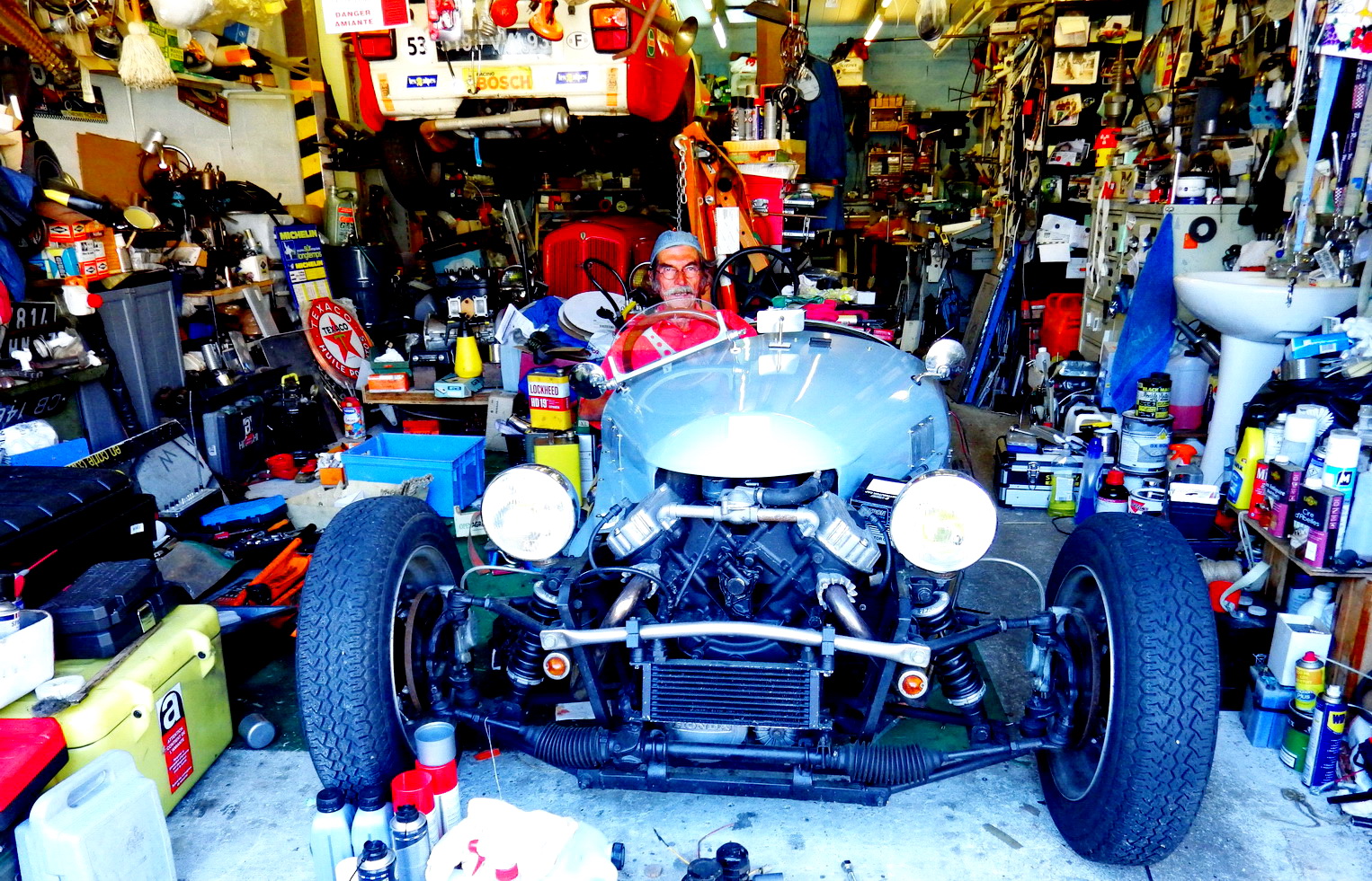 Bernard au volant de son Darmont 3 roues, deux autres voitures se cachent dans le capharnaüm de son garage ! levez les yeux, une Simca Rallye 2 est accrochée au plafond !