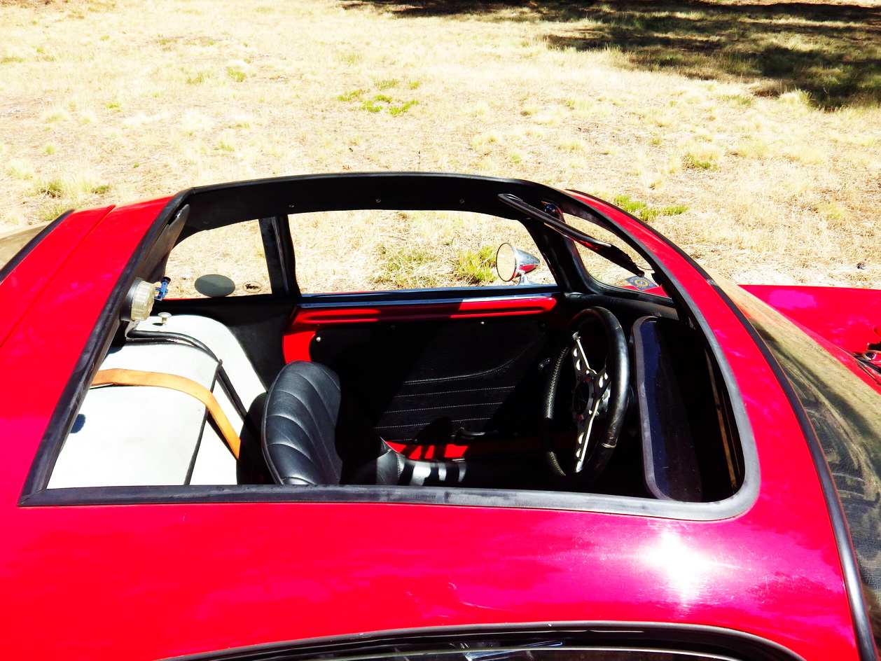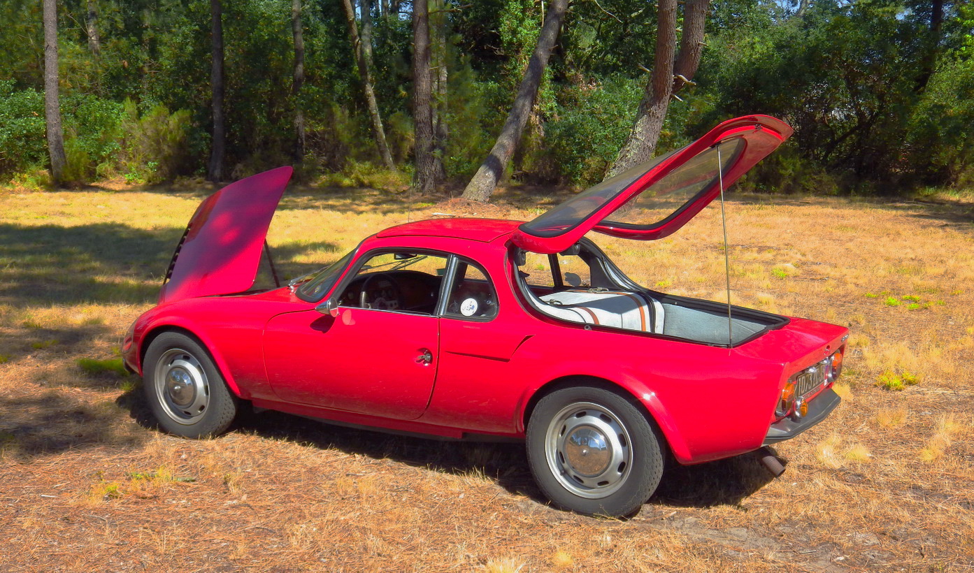 Ce modèle qui s'étale sous vous yeux est encore chaussé de ses grandes roues originelles avec ses ailes étroites avec en prime une option rarissime sous forme d'un toit ouvrant amovible permettant de mieux ventiler l'habitacle car on crevait de chaleur dans un Djet. On crevait de chaleur parce qu'il fut l'une des première voiture à moteur central générateur de calories situé carrément dans l'habitacle avec en prime la réverbération du soleil sous la bulle arrière vitrée. Assurant une répartition idéale des masses, ce moteur central lui permettait d'offrir une tenue de route digne des meilleures voitures de sport de son temps.