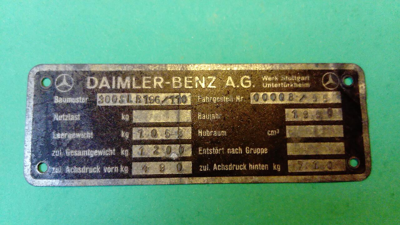 La transaction est faite depuis plusieurs jours et Robert, à titre de cadeau, donne à Michel une plaque métallique. Il s’agit d’une plaque d’identification d’une Mercedes 300 Slr de 1955. (8 exemplaires fabriqués)