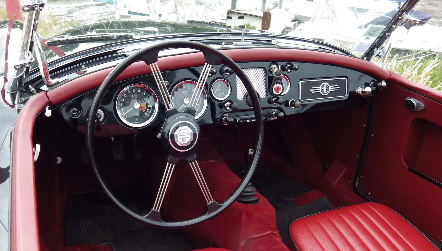 La MGA a été lancée fin 1955 après avoir été dévoilée aux 24 Heures du Mans quelques mois plus tôt. Il est évident que son styliste avait été également inspiré par les lignes de la Jaguar XK 120 et de l'Austin Healey. La courbure des ailes arrière, le capot plongeant, les portes qui descendent en pente douce sur les hanches rebondies sont plus proches d'une sculpture que d'emboutis industriels. Aucune poignée de porte extérieure ne vient polluer ses courbes (une MGA ne se ferme pas !). Noire avec l'intérieur rouge, son MGA semble fraichement sortie de l'usine d'Abingdom.