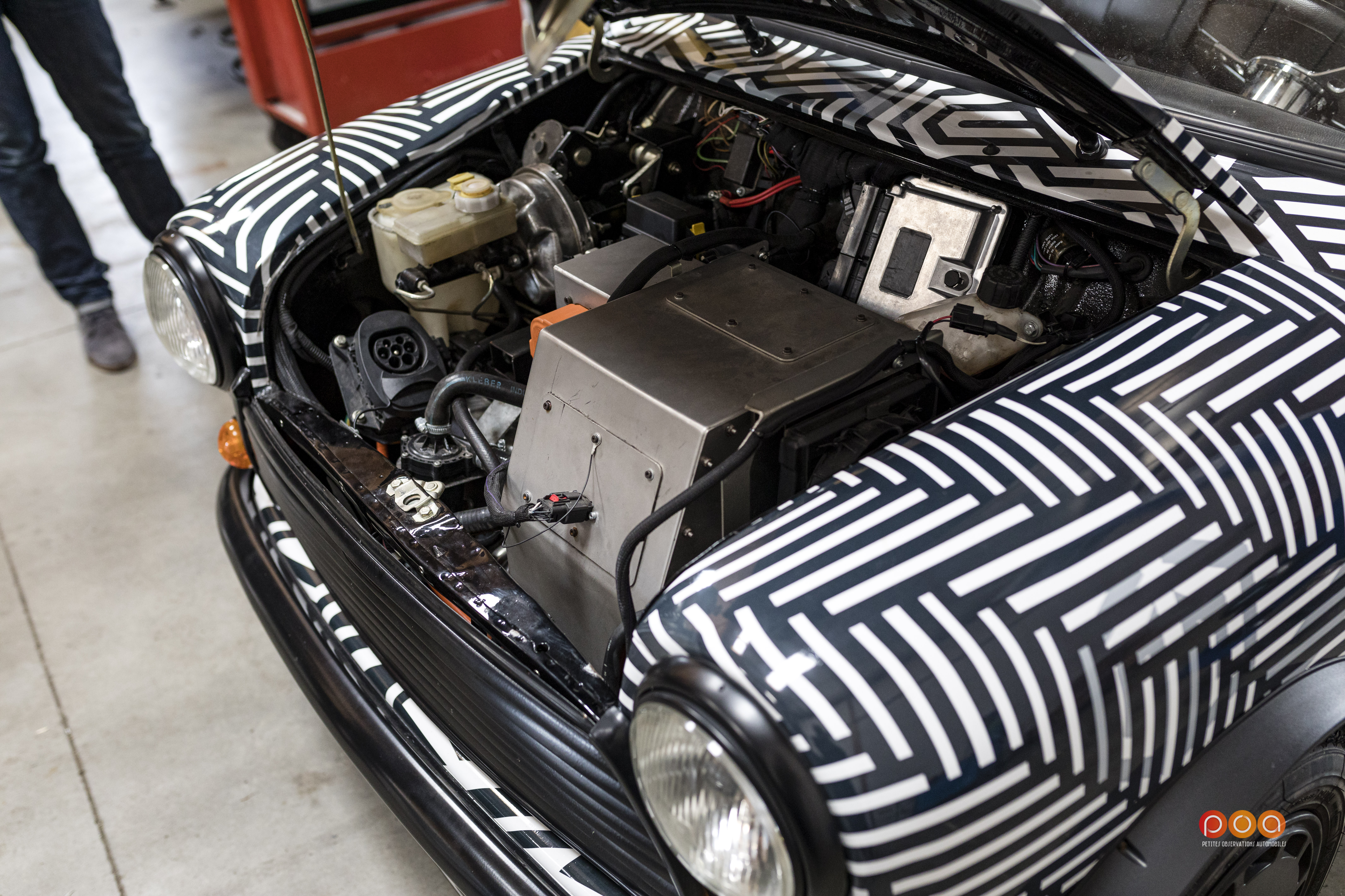 Mais redevenons sérieux, car la promesse de cette voiture est très intéressante. C’est Roland le chimiste, l’un des deux gourous de la Mini survoltée qui nous explique le parti pris fort concernant les batteries qui ne comportent pas de cobalt ni manganèse, mais que du lithium, du fer et du phosphate qui sont des métaux peu polluants et facilement extractibles. Le prix à payer pour cette batterie vertueuse est l’autonomie qui n’est “plus que” de 150 km. Mais les cellules de la batterie vissées entre elles sont une autre propriété de cette voiture qui permettent de la recycler facilement.