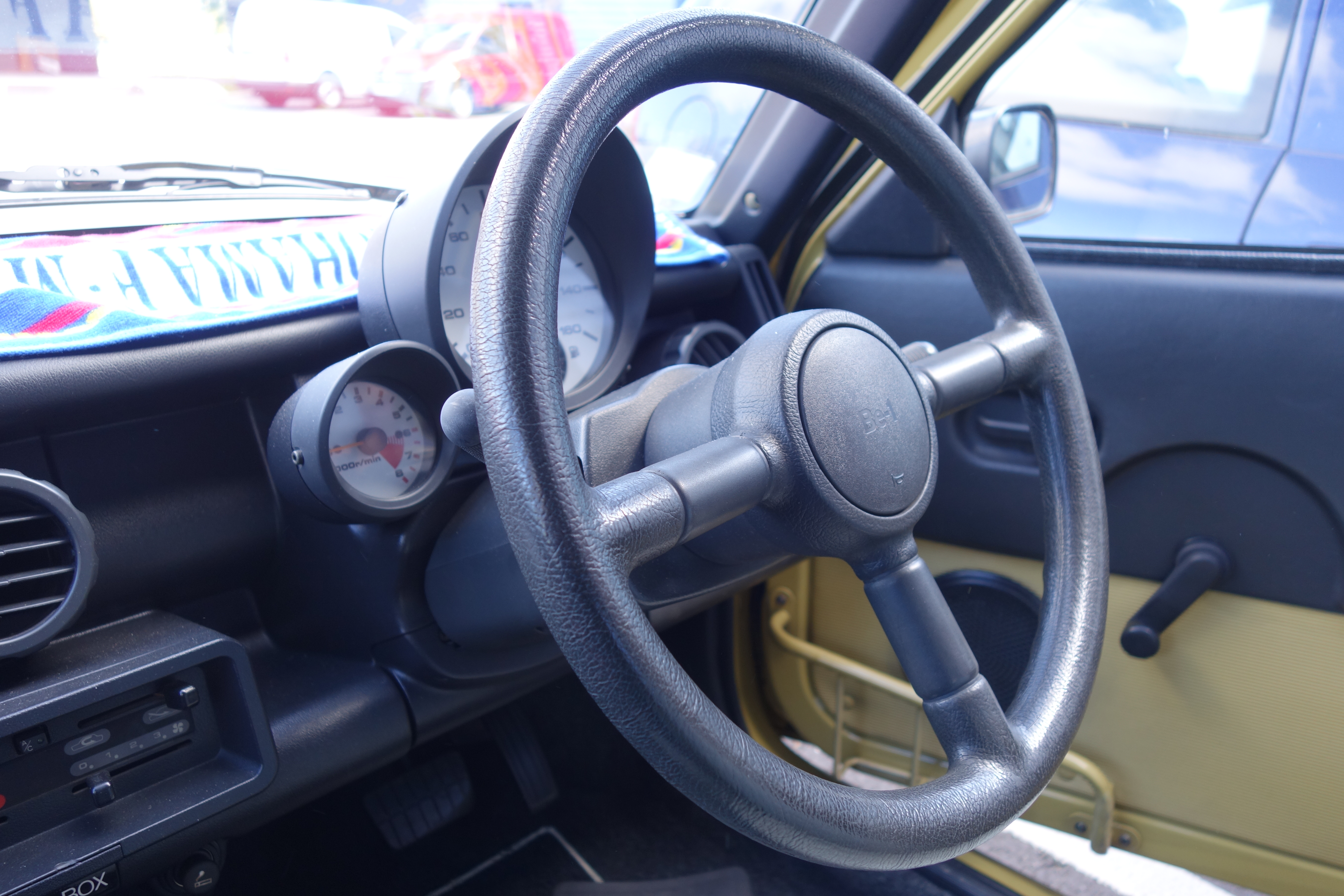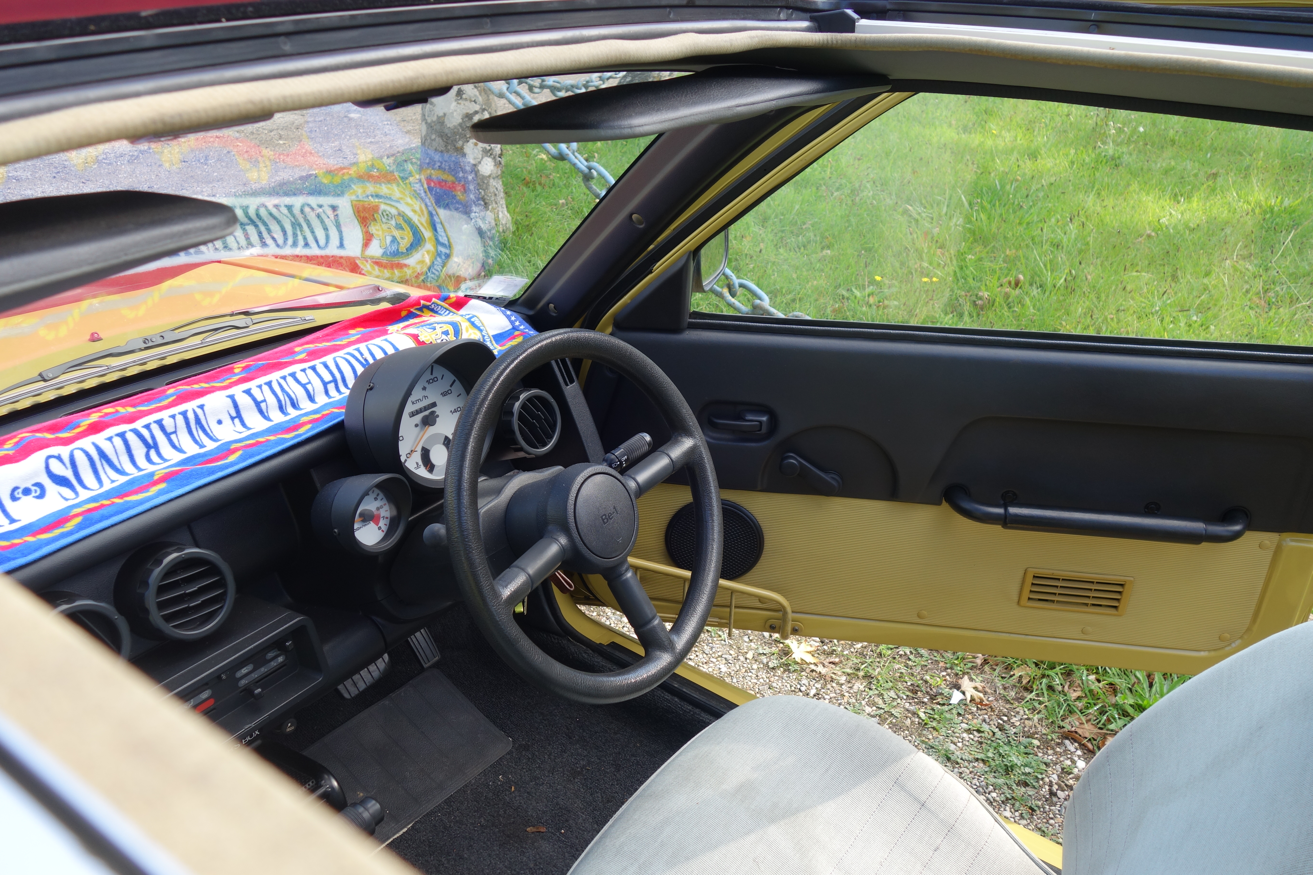 Si vous êtes fidèle lecteur d’Auto Rétro vous l’avez vu opposée à une Twingo dans le numéro de rentrée 2019. Volontairement construite à seulement 10.000 exemplaires entre 1987 et 1988, la Be-1 est équipée de panneaux de carrosserie synthétiques recyclable (une première mondiale selon Nissan) limitant son poids à 670 kg. L’auto pouvait être équipée d’un toit ouvrant toilé électrique Webasto renforçant encore son sex appeal. Les couleurs proposées étaient le jaune potiron, le bleu hortensia, le rouge tomate et le blanc oignon. Les roues étaient peintes de la couleur de la carrosserie. La puissance modeste du 4 cylindres (55 cv à 6250 tr/min) accouplé à la boite automatique sur la plupart des modèles détermine le caractère citadin de l’engin.