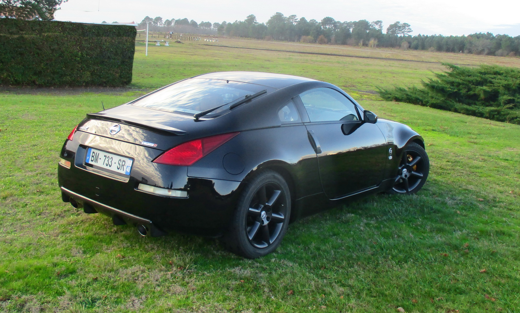 La loi de Murphy existe. Alors que mes oreilles devinent dans le lointain le magnifique chant du 6 cylindres de la Nissan 350 Z, le ciel décide de se voiler de noir. Pas idéal pour photographier une voiture également noire, teinte haïe par les photographes ! Puis, les piles de mon appareil photo décident de se mettre en grève. Maintenant c'est l'objectif de mon deuxième appareil de secours qui laisse deviner une belle rayure !