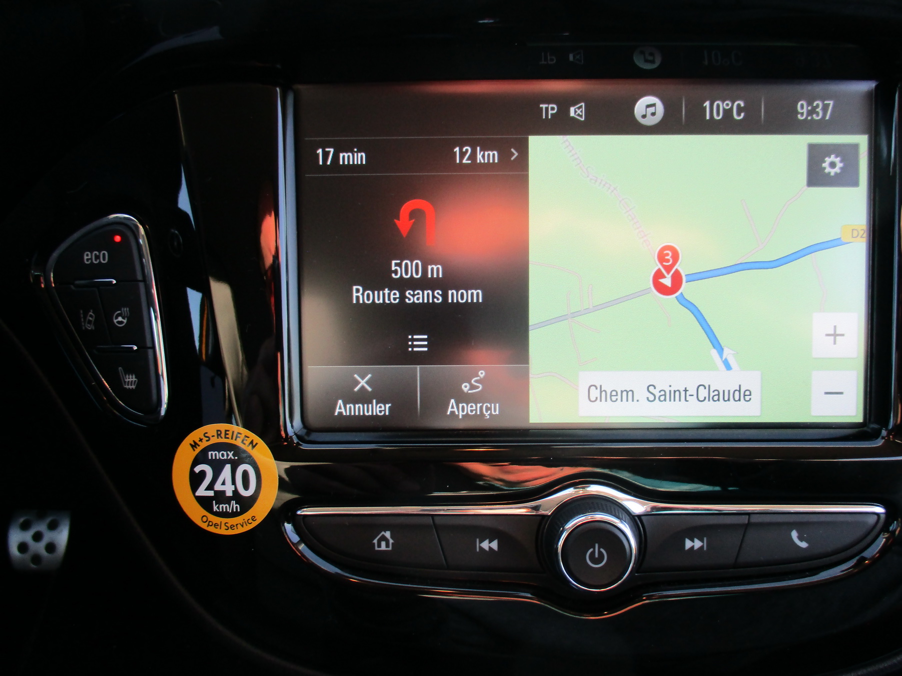 Le GPS de série trop bas est très mal placé. On remarquera le badge qui limite la vitesse à 240 km/h en Allemagne lorsqu'on est chaussé de pneus neige. Édouard Philippe n'imagine même pas !