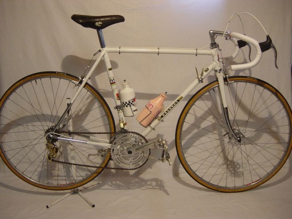 Il était de type demi-course, muni d’un simple plateau trois vitesses, roue libre et dérailleur Simplex, enrubanné de guidoline sur le cintre et autour des cocottes et décoré de marquages à damier noir qui tranchaient sur son cadre blanc. Outre le râtelier à bagages, il était fâcheusement lesté de garde-boues en ferraille et d’un dispositif d’éclairage réglementaire qui s’enclenchait par dynamo.