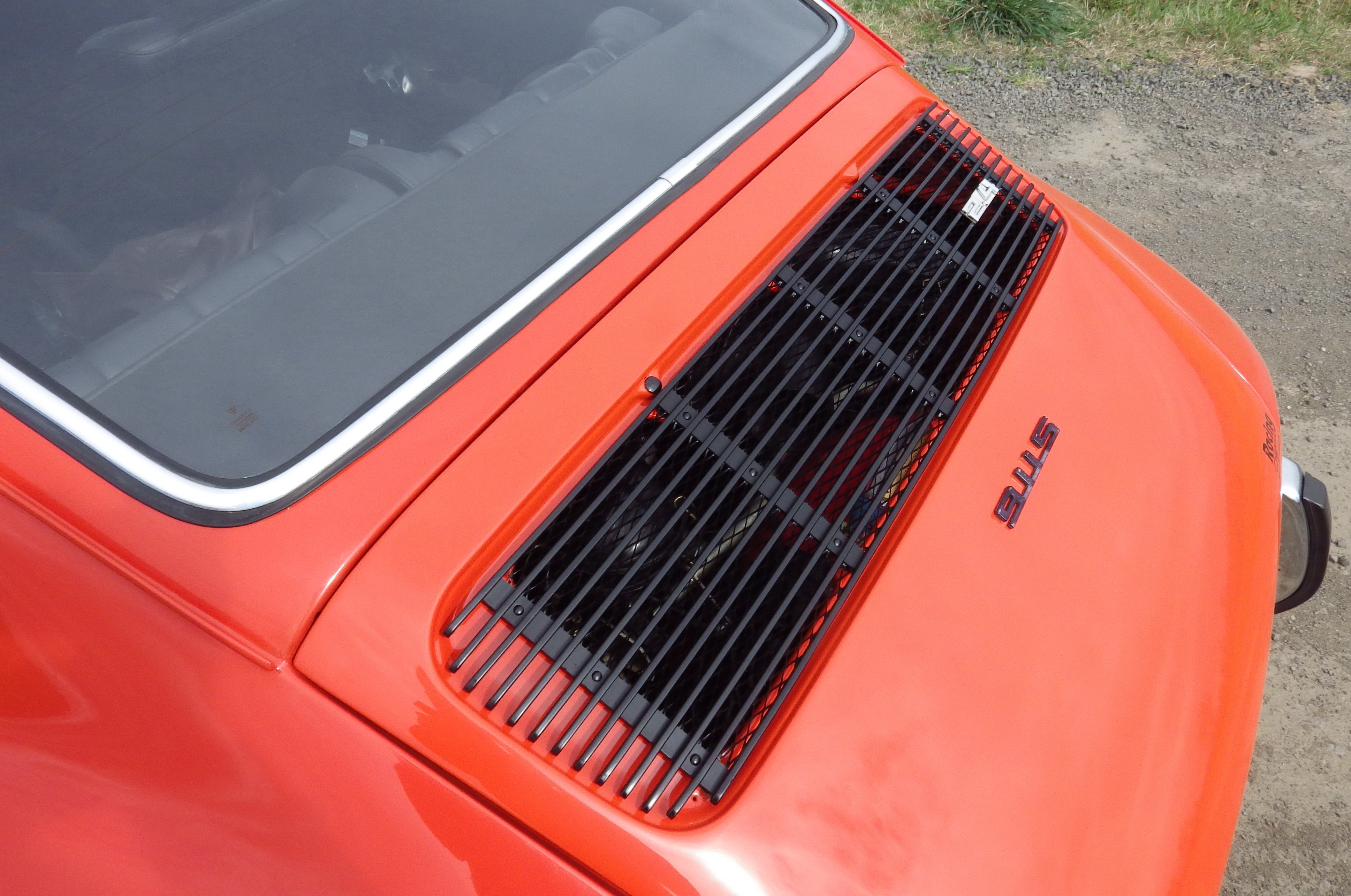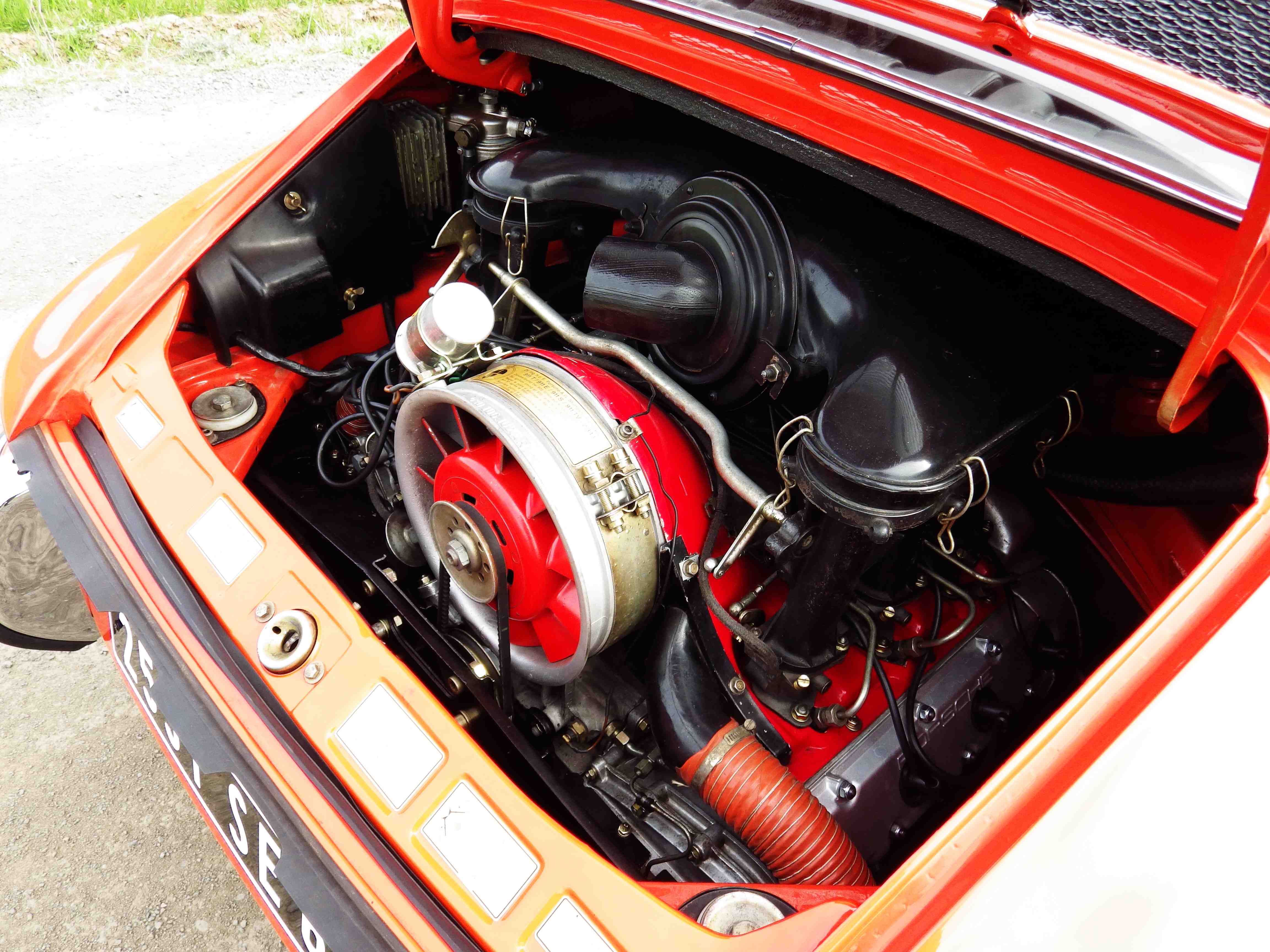 Frédéric Chambon a acheté ce gros bonbon orange il y a presque 20 ans. Elle avouait déjà plus de 400 000 kilomètres. Après avoir refait toute la voiture et mise en configuration course, il a participé à son volant et avec succès à plusieurs rallyes avant de la délaisser pour une 2 litres plus ancienne plus intéressante au niveau du championnat puis une 993 Turbo. Il a remis la 2,4 l en configuration routière identique à celle qu’elle avait lorsqu’elle est sortie de l’usine. Reconditionné de A à Z, sa Porsche affiche, comme on dit, un état concours. Sa teinte Orange Sanguine 018 dite couleur sécuritaire très prisée ces années là, ajoute encore du charme au charme