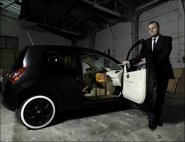 Le couturier touche à tout Jean Charles de Castelbajac a rebondi sur l'idée d'une Renault Twingo présidentielle, dont l'intérieur reprend la décoration du salon rouge de l'Elysée. Visite privée en vidéo et décodage du message subliminal.