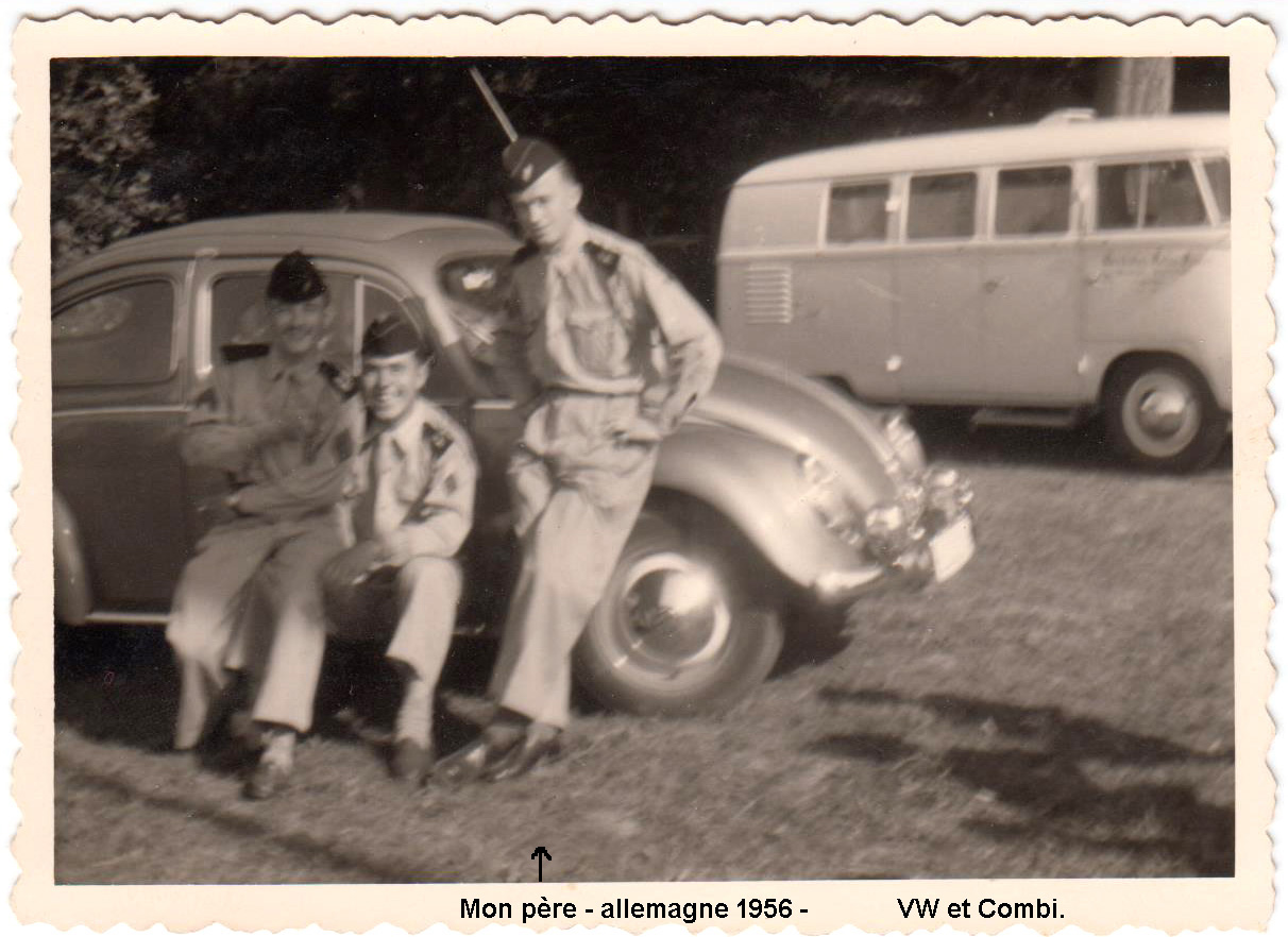 Cette année 1956 mon père est appelé sous les drapeaux. C’est à Coblence en Allemagne qu’il rejoint un contingent français. Il passe plusieurs mois de classe à ferrailler dans la campagne germanique. Mon père aime la mécanique auto, souvent au village il réparait la voiture des copains. À la caserne, il gagne un peu d’argent de poche en réparant les voitures de ses supérieurs.