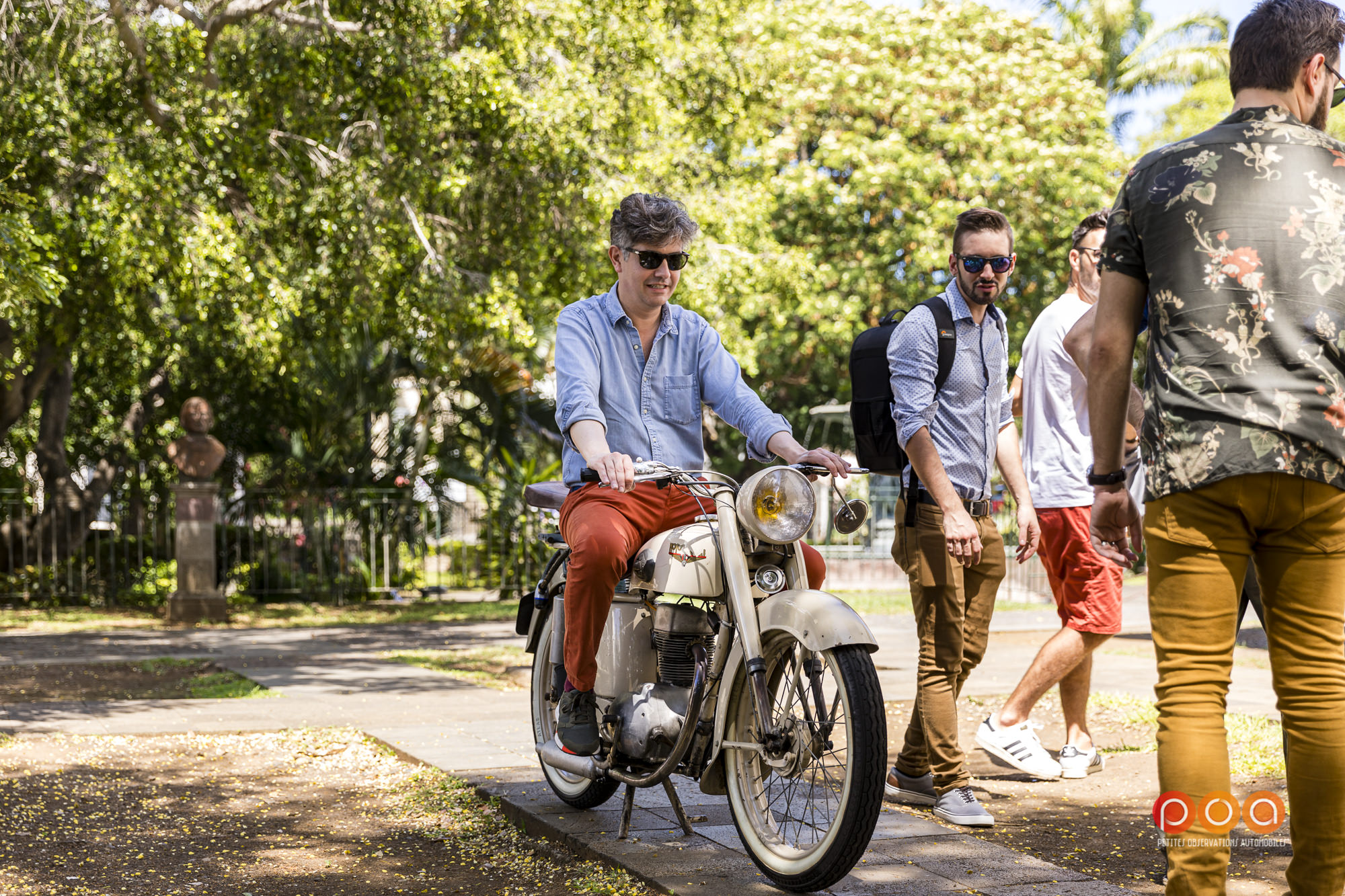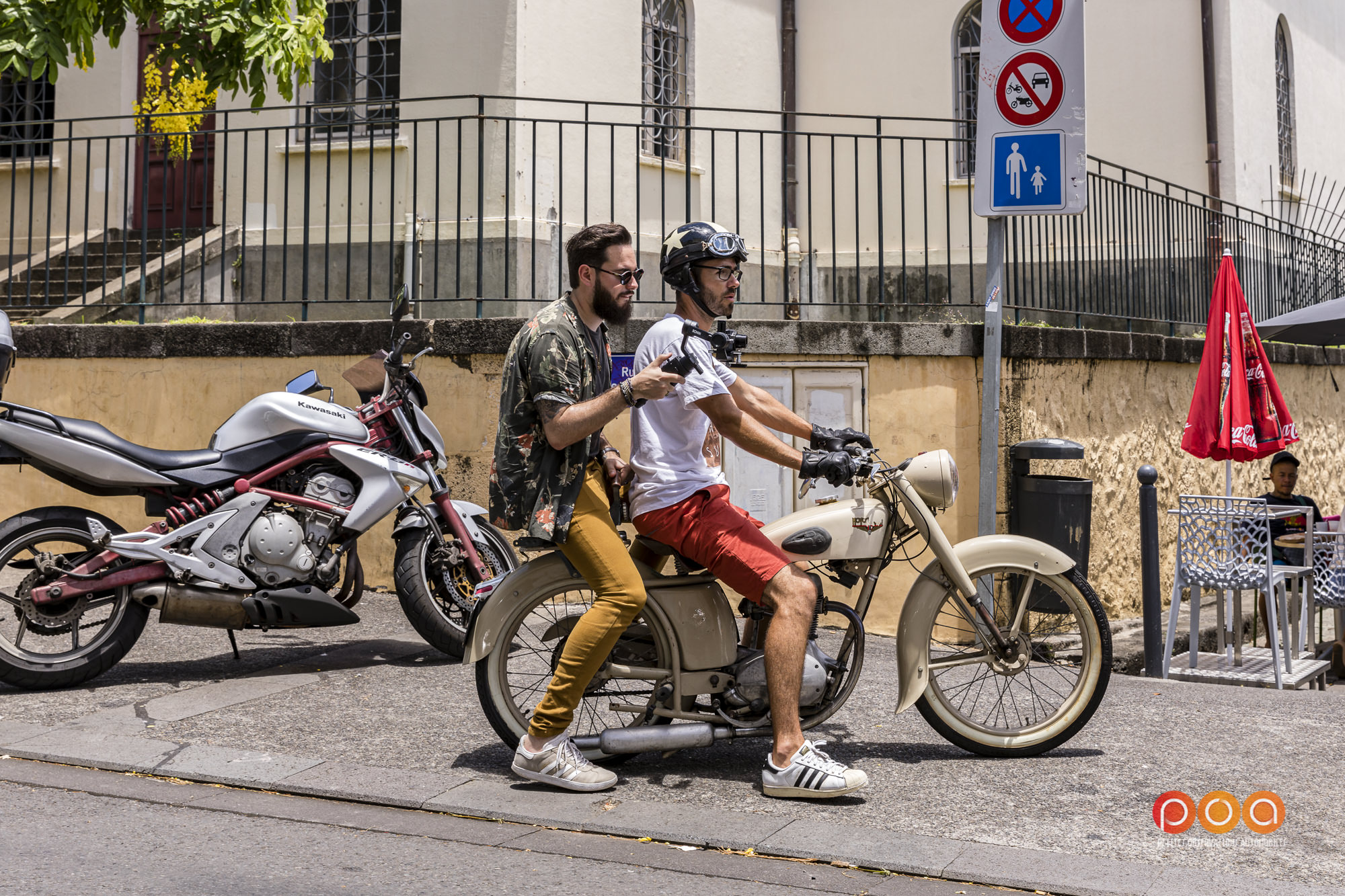 Nous sommes suivis par Julien et Eric, sur sa Motoconfort U57C 125 cm3 monocylindre, avec laquelle il roule tous les jours. Un cortège qui serait bien rare en métropole !