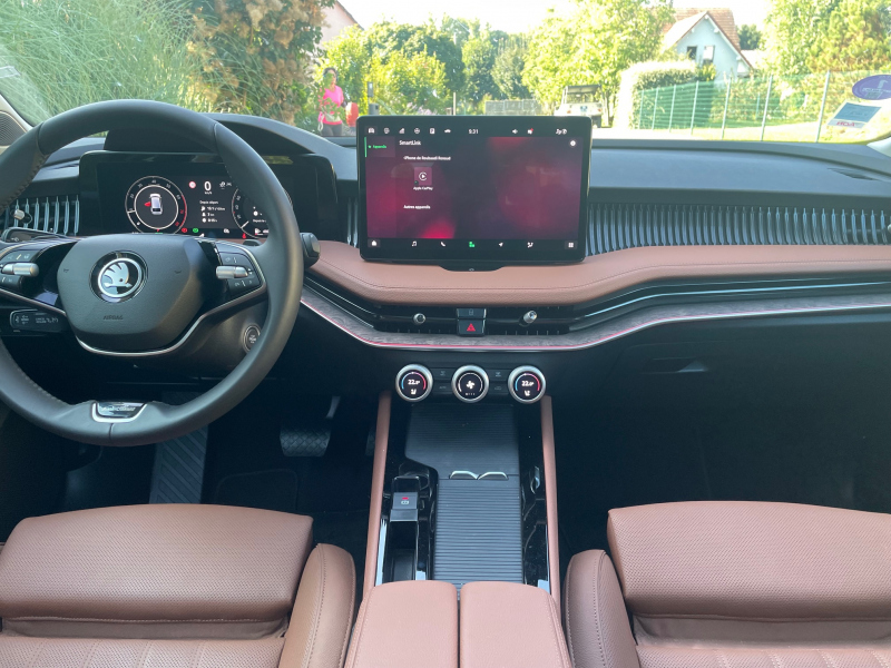 La nouvelle Skoda Superb a même droit au système d'info-divertissement de dernière génération du groupe Volkswagen. Il s'avère fluide et facile à utiliser, même si l'on aurait préféré une intégration plus discrète du grand écran central de 12,9 pouces, qui semble très en hauteur. Skoda a fait le choix de garder des boutons physiques pour les commandes de chauffage et de climatisation, et c'est heureux. Mais ces petites molettes nécessitent un petit temps d'adaptation, car chacune d'entre elles commande plusieurs fonctions.