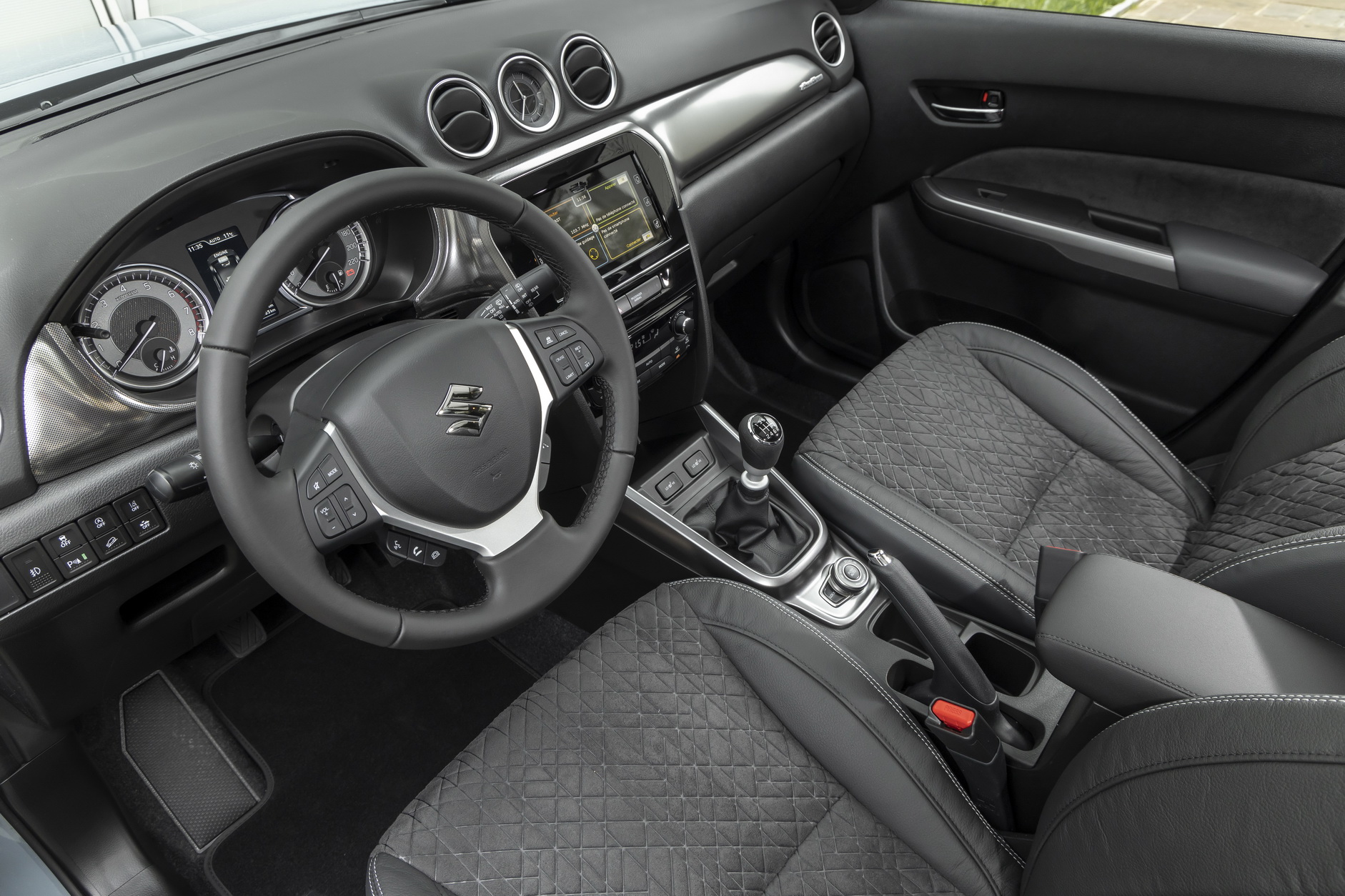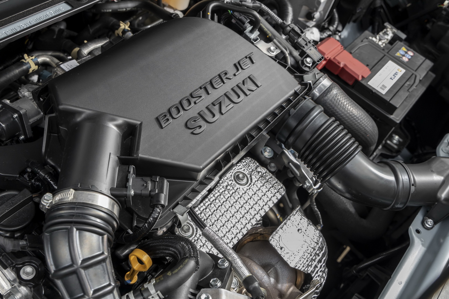 Suzuki avait timidement commencé, il y a 4 ans l'hybridation légère avec la Baleno qui vient d'être supprimée du catalogue victime de ses trop fortes émissions de CO2 (143 g/km en norme WLTP). Cette fois, le Japonais est allé plus loin avec le système SHVS comprenant une batterie plus puissante de 8 ah en 48 volts toujours cachée sous le siège passager. Elle alimente un alterno-démarreur électrique bien plus puissant de 10 kW (13 ch) nourri automatiquement par l'énergie du freinage récupérée par la batterie. Il permet d'aider le moteur thermique en lui fournissant davantage de couple au démarrage avant que le turbo rentre en action avec un gain en consommation puisque exigeant moins de ce dernier à puissance égale. Suzuki a rajouté aussi une fonction roue libre qui arrête le moteur lorsqu'on débraye tout en continuant à le faire tourner au ralenti à 800 tr/mn grâce à l'électricité pour éviter un brusque à-coup lorsqu'on relâche la pédale. Ce moteur électrique est uniquement accouplé au 4 cylindres essence de 1400 cm3 Boosterjet turbocompressé qui a été profondément revu au niveau de l'injection d'essence avec un double calage variable de la distribution qui se solde par une perte de 11 chevaux soit 129 contre 140 précédemment. Du coup, le merveilleux petit 3 cylindres a disparu des trois modèles et c'est bien dommage, toujours pour la même raison.