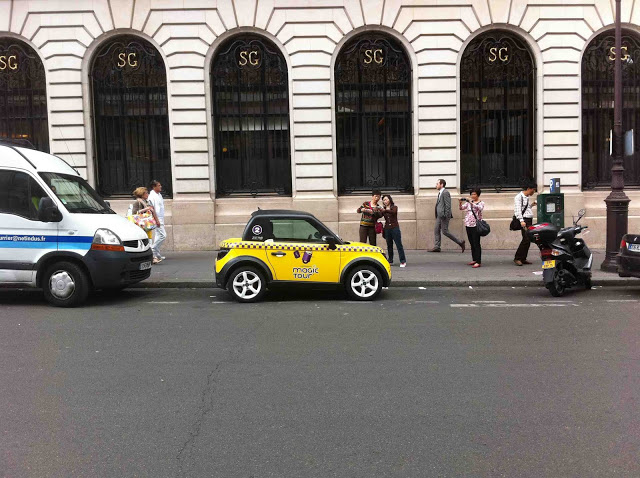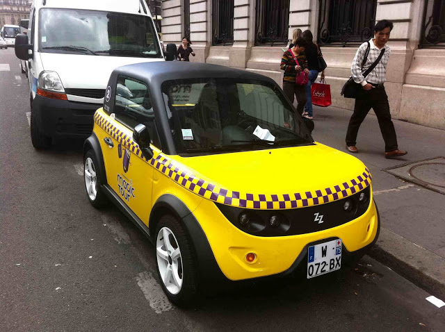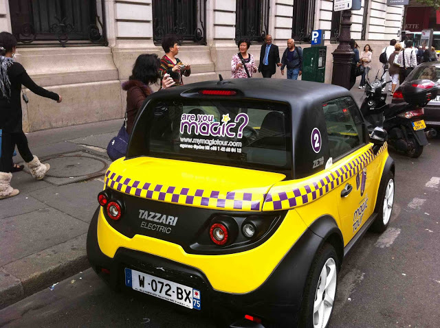 Renseignement pris, il s’agit d’une Tazzari Zero, une micro car électrique vendue au alentour de 20 000 €. Intelligemment, c'est une agence de voyage, Magic Tour, qui promène les touristes à son bord pour visiter Paris tout en faisant sa pub. Et ça marche, la preuve j'en parle !