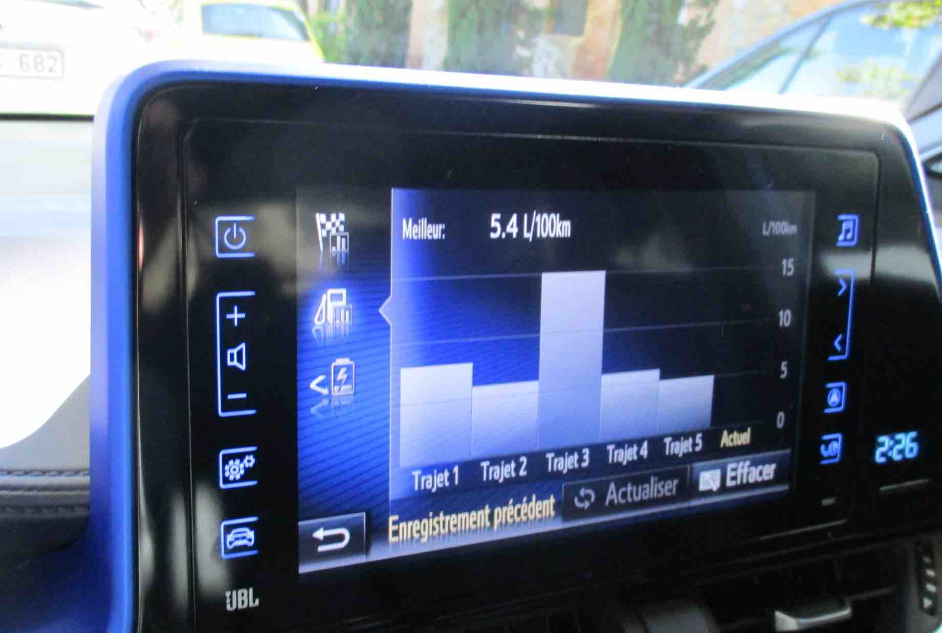 Conso moyenne de 5,4 l (3,8 l constructeur). On peut mesurer que sur le parcours 4, on a exploité les 122 chevaux et ça se voit !