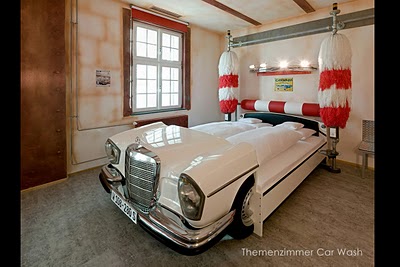 Le V8 Hôtel à Stuttgart propose des lits dans des véritables carrosseries de voitures et une ambiance digne d'un garage de luxe...