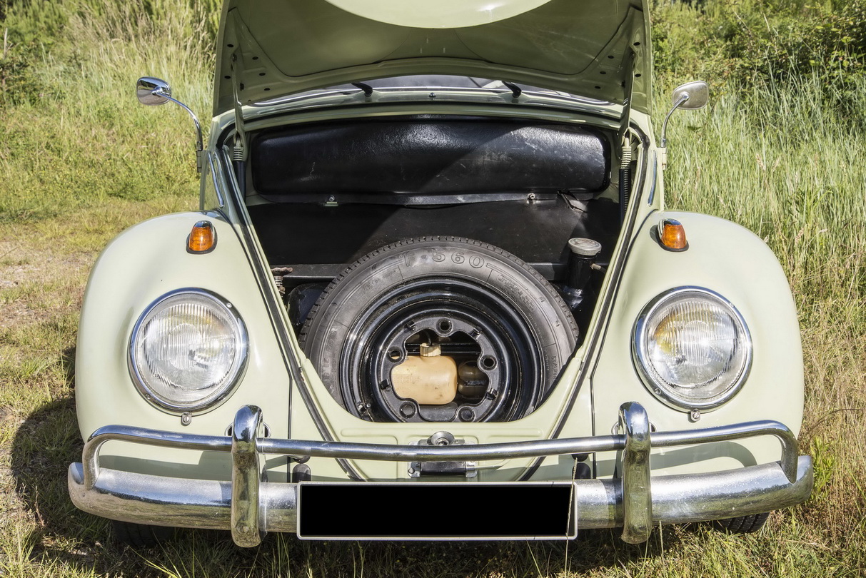 La VW était critiquée pour son petit coffre. C'est la pression de la roue de secours qu'il fallait gonfler régulièrement qui assurait le fonctionnement du lave-glace