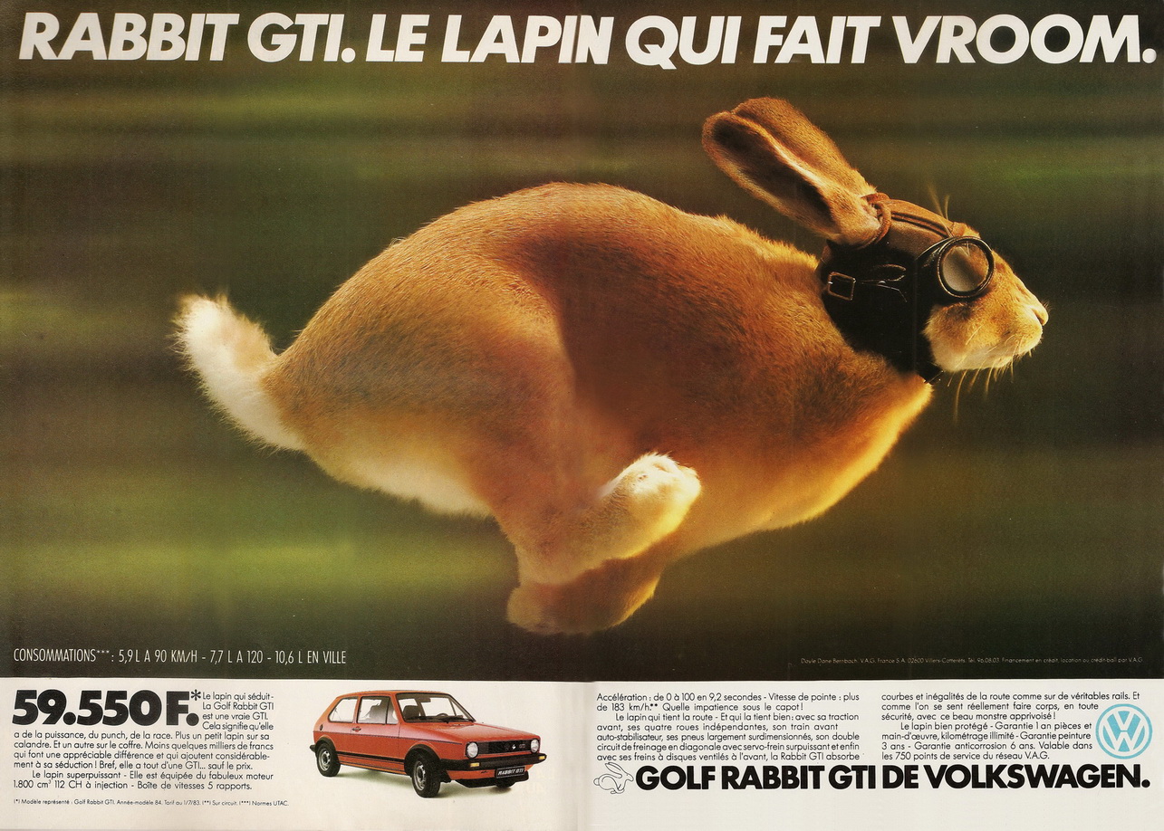 Formidable pub pour la Rabbit sous la forme d'un lapin galopant coiffé d'un bonnet de cuir avec des trous pour laisser passer les oreilles !